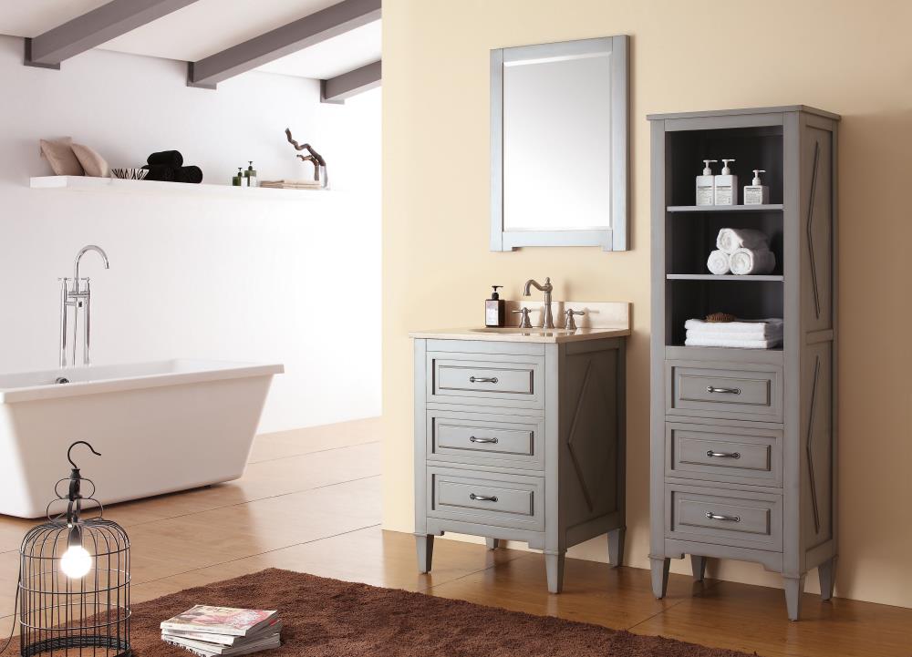 • Elegant Finish: Painted grayish blue cabinet with antique nickel hardware