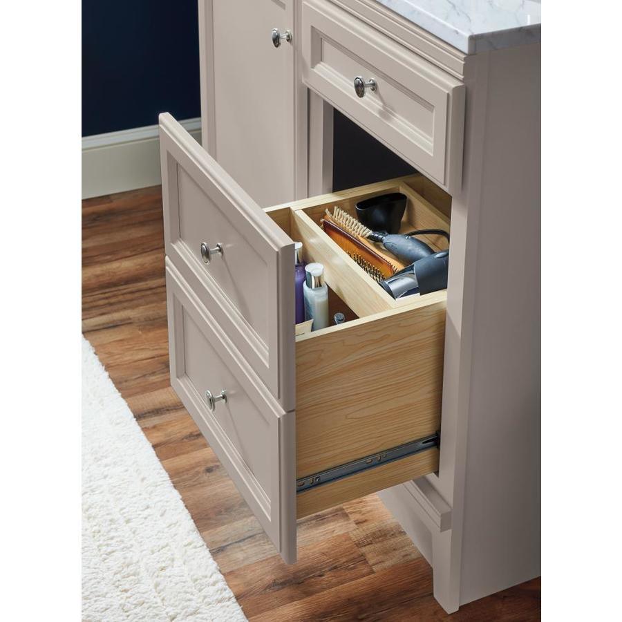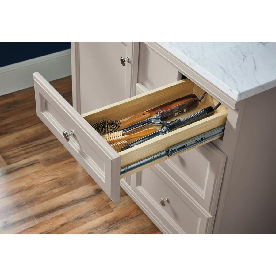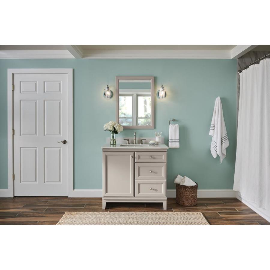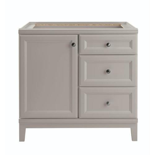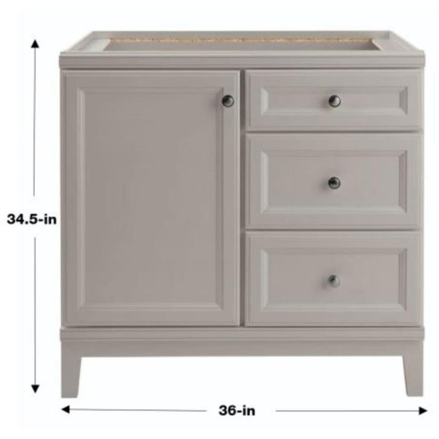 Gray finish vanity from the Calhoun collection effortlessly blends with every style Features 2 full extension drawers and a cabinet door Great for transitional style decor Compatible with 37-in W x 22-in D vanity tops (sold separately) 36-In W x 21-in D bathroom vanity Brushed nickel finish hardware adds a touch of shine Fully assembled and ready to be installed Select sizes available for pickup today in stores All collections and sizes available for delivery to store within 7 days or less