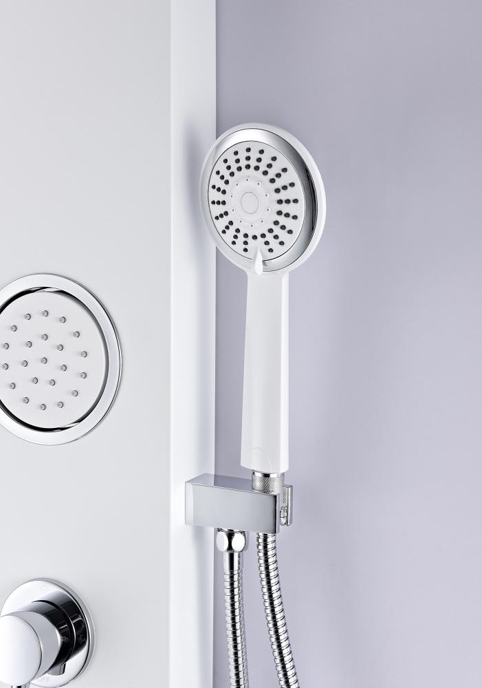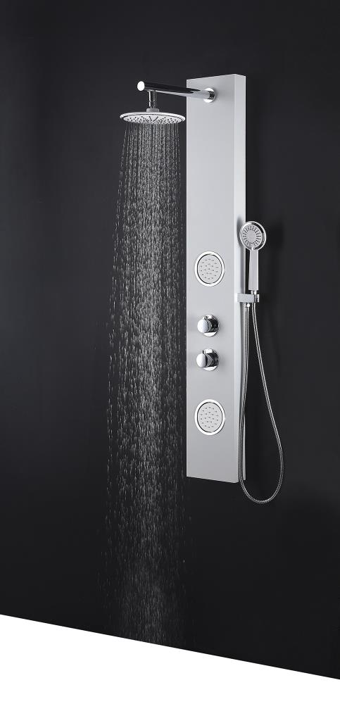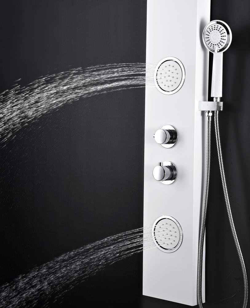 Upgrade your bath with the ANZZI Aquifer, a slim aluminum shower panel featuring a Heavy Rain overhead shower, euro‑grip handheld sprayer, and two Acu‑Stream body jets. A solid brass valve and 3‑way diverter deliver reliable performance and customizable water flow in a clean white finish.
