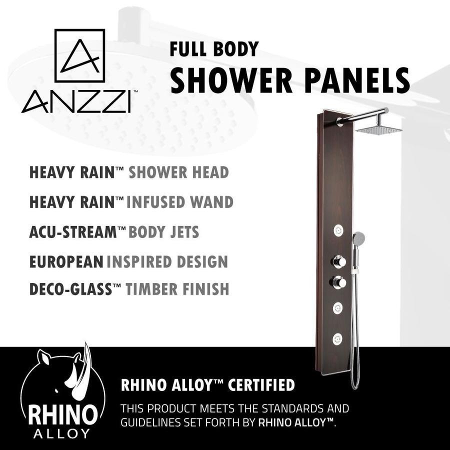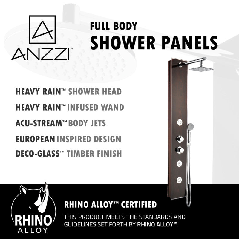 Elevate your bath with ANZZI’s Pure Series full-body shower panel featuring a mahogany-style Deco-Glass finish. Enjoy a swiveling Heavy Rain shower head, a 3-setting handheld wand, and Acu-Stream body jets powered by durable RHINO ALLOY certified stainless steel and solid brass valves.