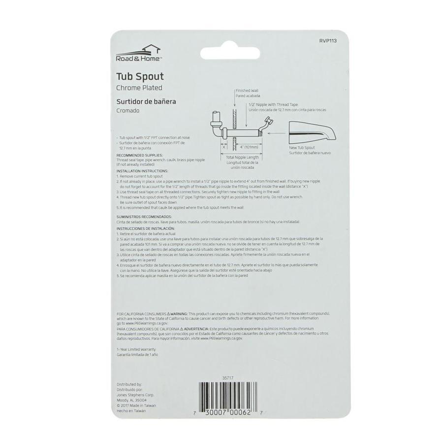 Made of chrome plated zinc, giving the tub spout a level of durability and aesthetic shine Fits the 1/2 inch fitting of a female-threaded stub out Designed for RV and mobile home bathrooms