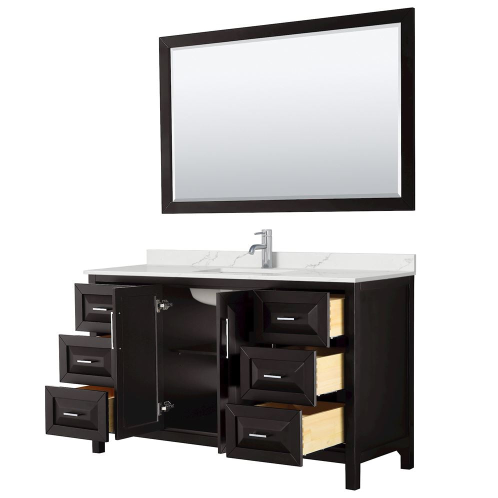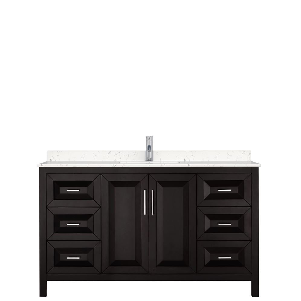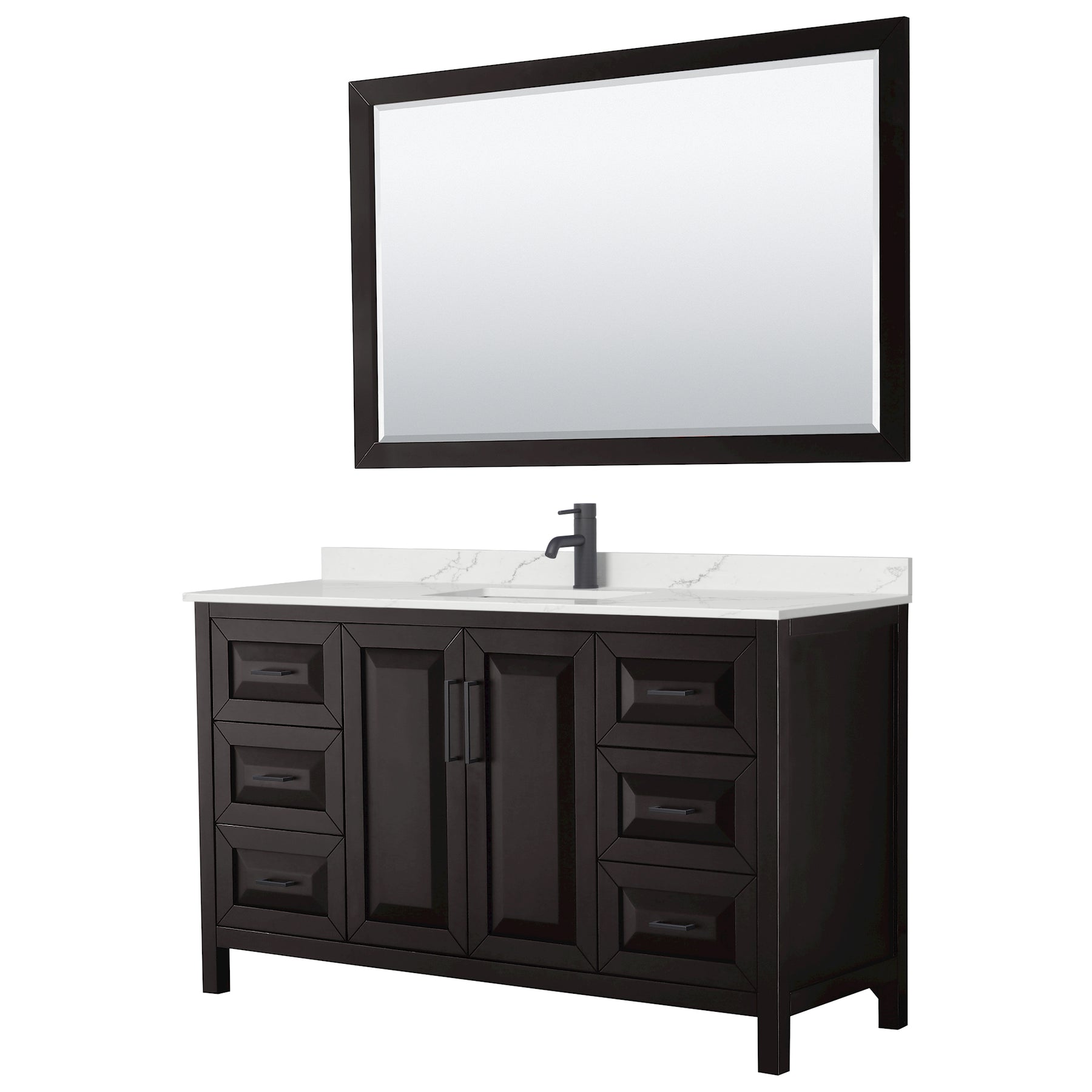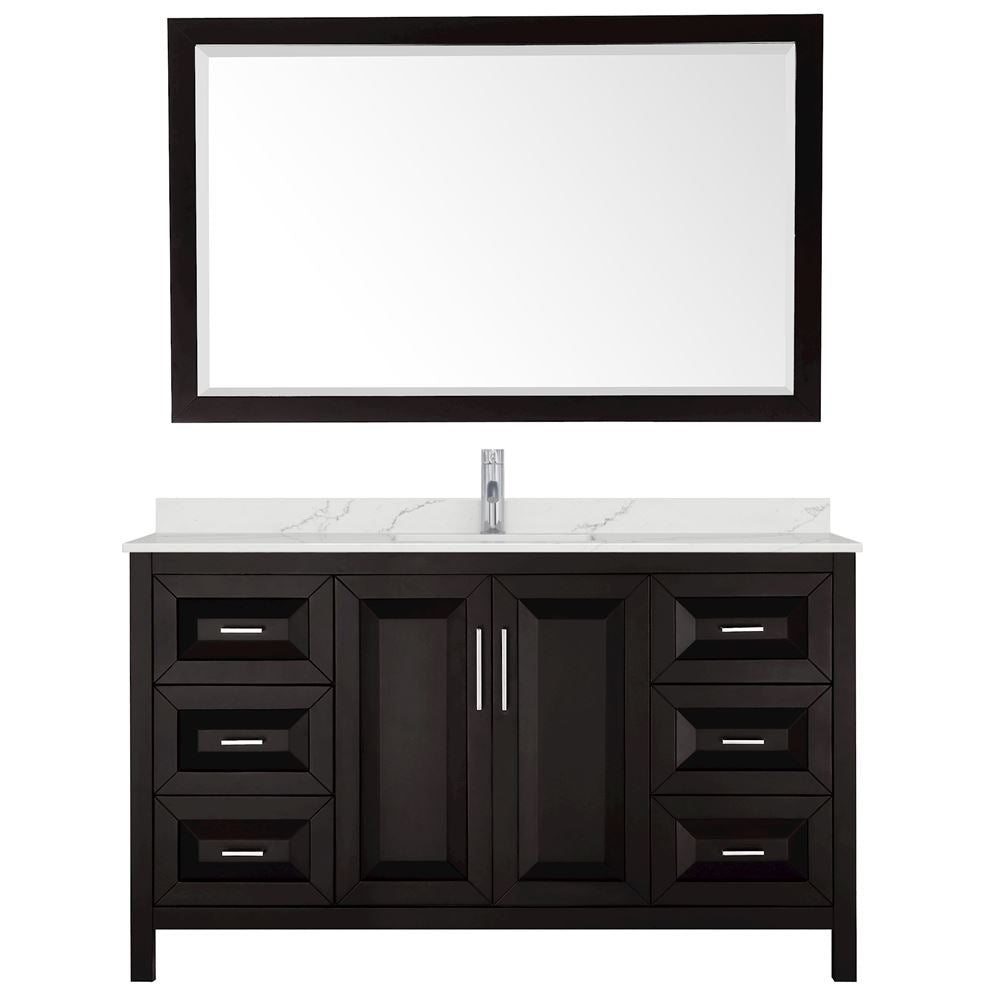 The Daria 60-inch single-sink vanity from Wyndham Collection pairs a durable, water-resistant wood cabinet with a White Carrara marble countertop and matching framed mirror. Soft-close doors and drawers, undermount square sink, and ample storage deliver a refined, functional centerpiece for any bath.