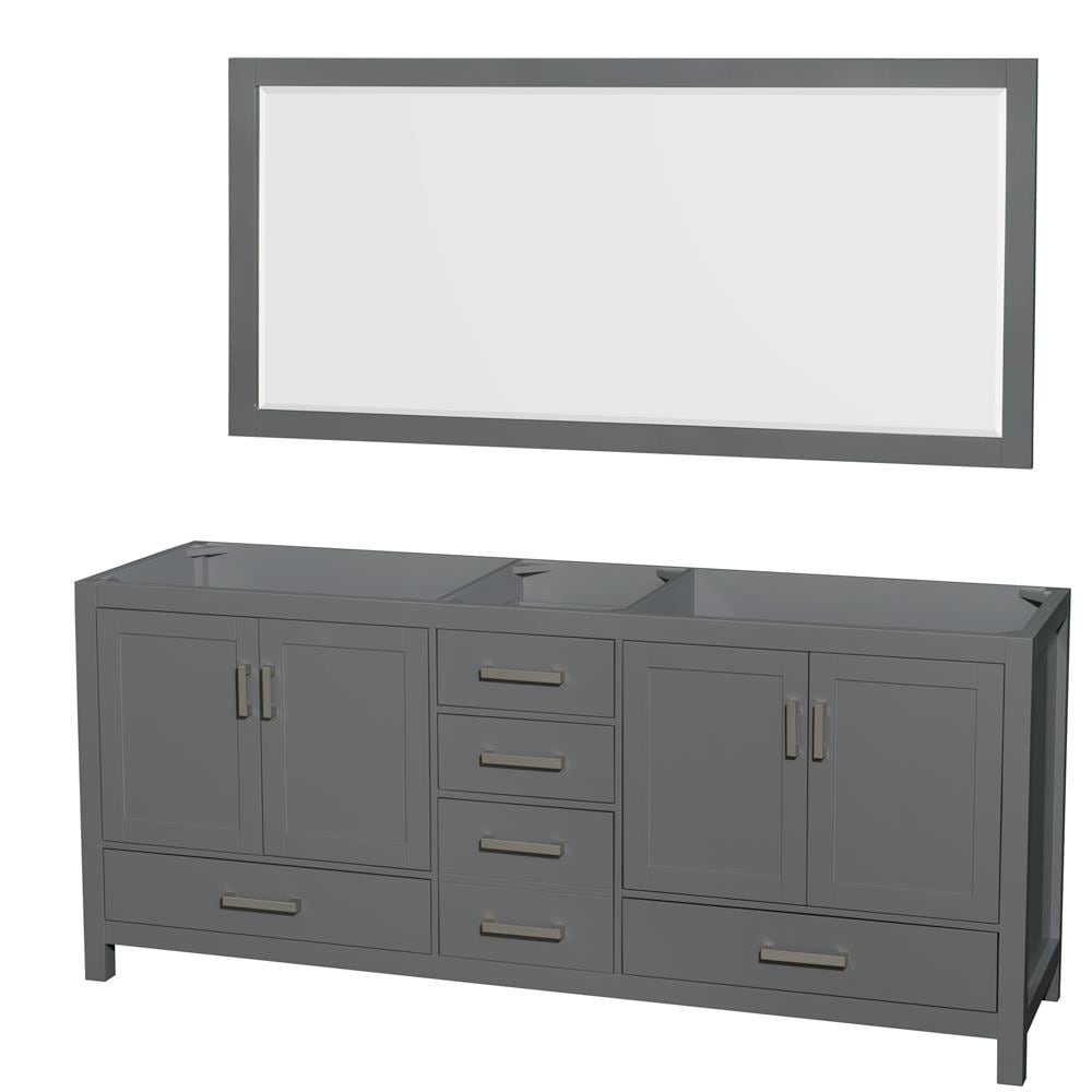 The Sheffield by Wyndham Collection is a freestanding 78.5-in dark gray vanity cabinet crafted from solid wood with a durable, low-VOC sealed finish. It includes a wide matching mirror and soft-close hardware, delivering generous storage and contemporary styling for master baths.