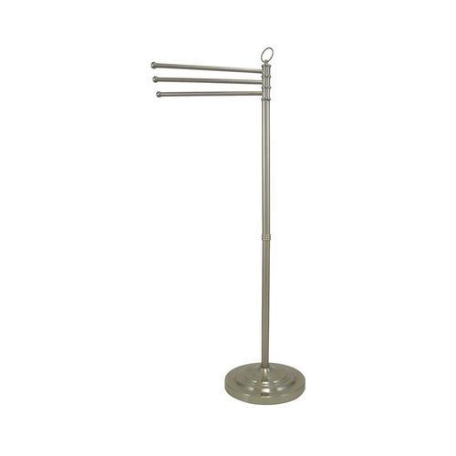 A polished chrome freestanding towel rack with three swivel bars adds instant storage without drilling. Built from durable metal with a scratch-, corrosion-, and tarnish-resistant finish, it stands 40.75 inches tall with a stable 10-inch base.
