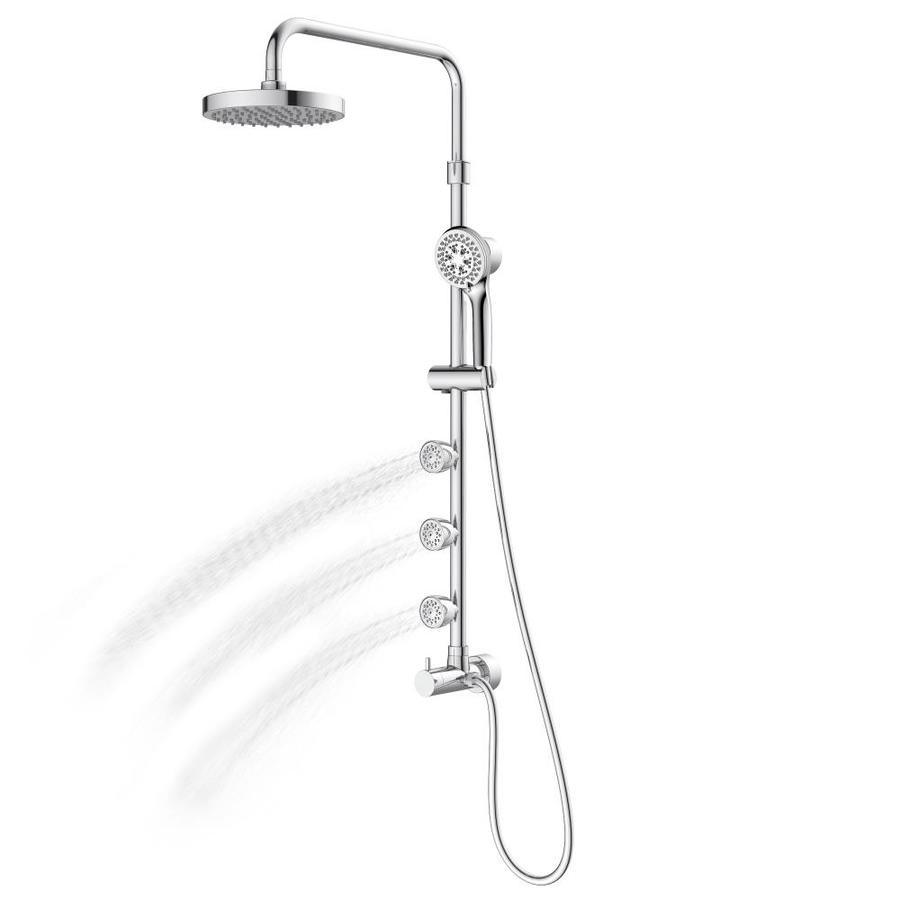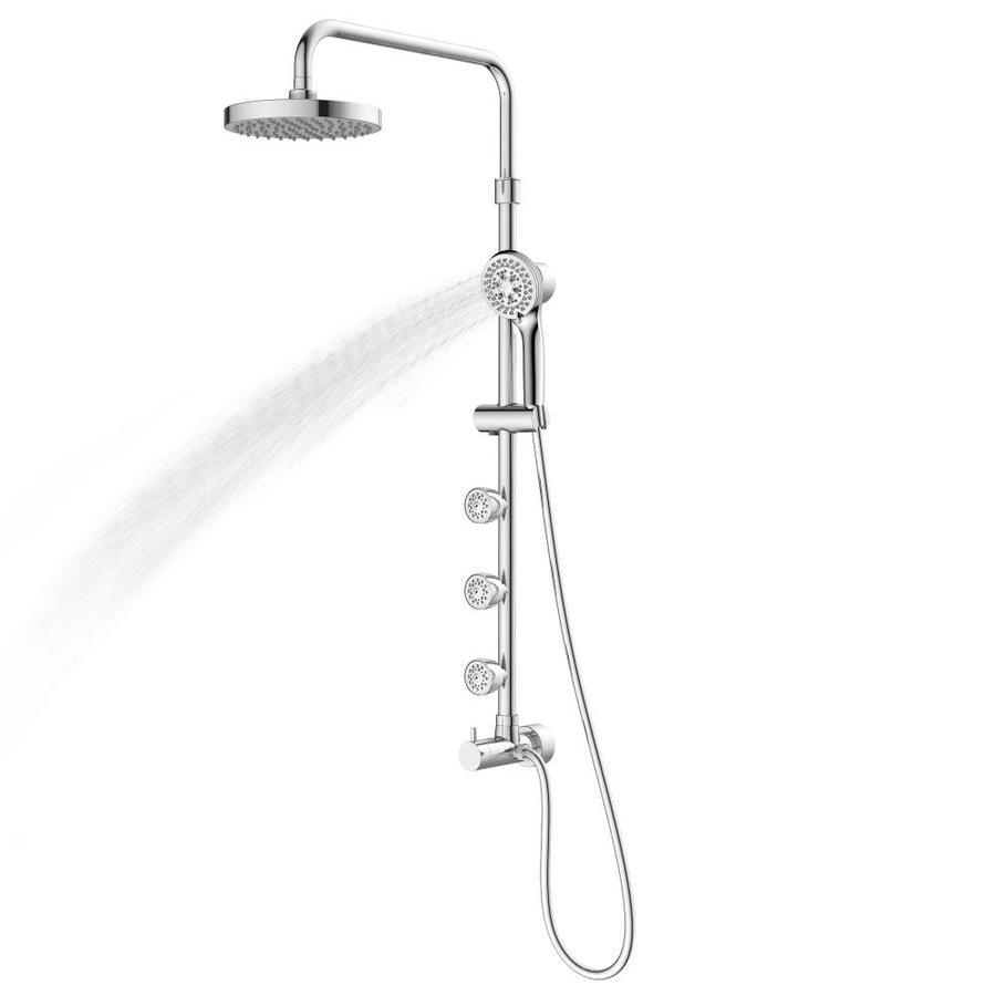 Surface mounted and completely pre-plumbed. easily retrofit your existing shower without a remodel Pivoting shower arm with 3-in of height adjustment 8-in Rain ShowerHead with soft tips to clear mineral buildup for long lasting performance Brass construction, ABS components, chrome finish