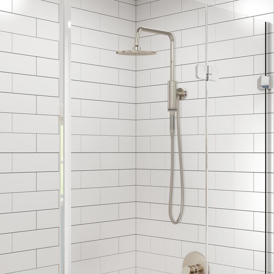 Surface mounted and completely pre-plumbed. easily retrofit your existing shower without a remodel All brass construction in brushed-nickel finish 8 In. rain showerhead with soft tips to clear mineral buildup for long lasting performance Invigorating hand shower with 59 double-interlocking stainless steel hose
