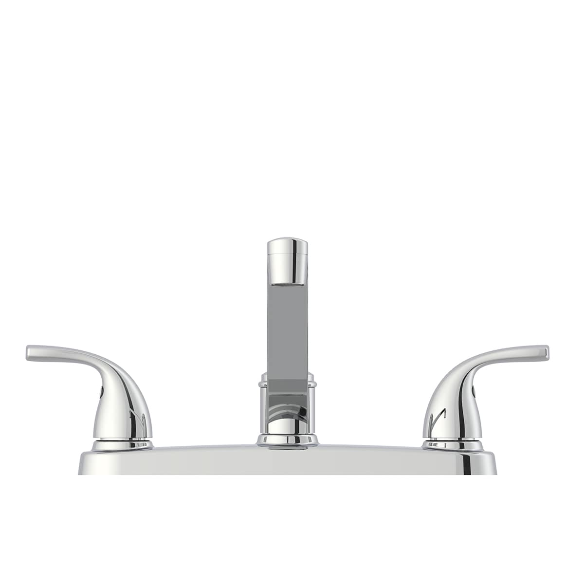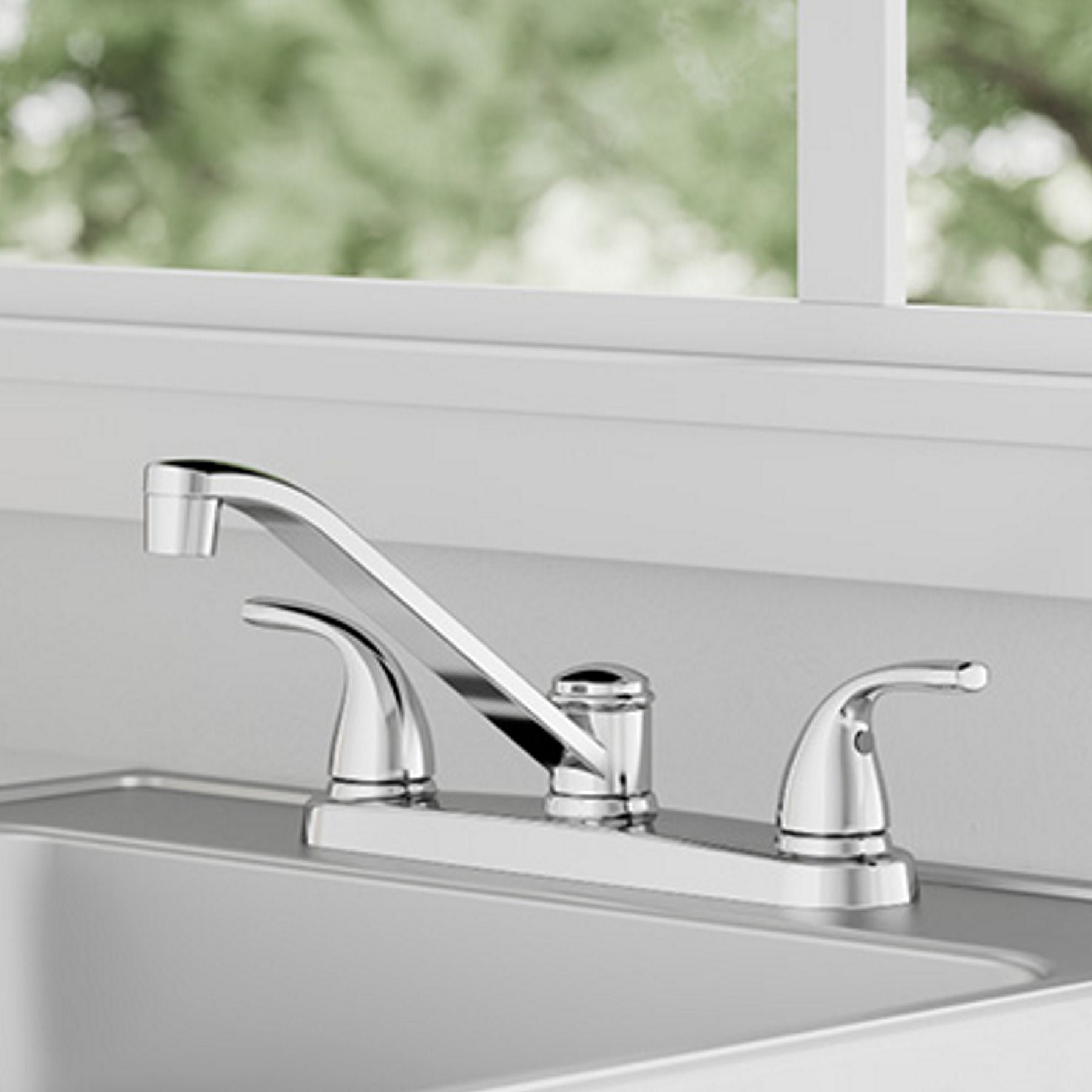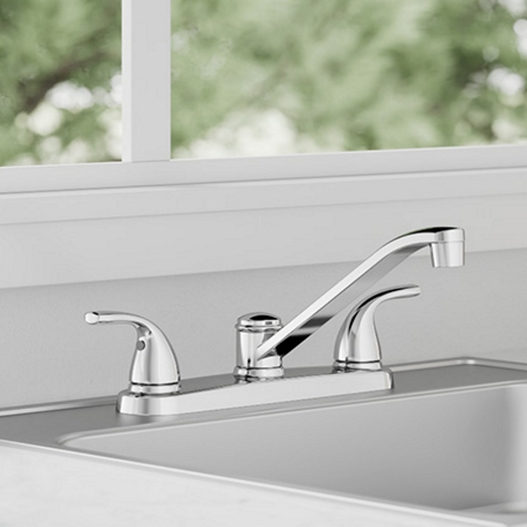 A budget-friendly, transitional kitchen faucet with a polished chrome finish and dual lever handles. Designed for 3-hole, 8-in center installations, it features a washerless cartridge for smooth, drip-free operation and a 1.75 GPM flow rate.