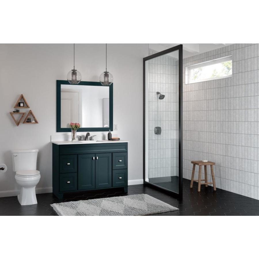 Maritime finish vanity from the Goslin collection blends well with most bath decor 48-In W x 21-in D x 34.5-in H vanity, perfectly sized for any bathroom Features 4 full-extension drawers and 2 cabinet doors Compatible with 49-in W x 22-in D vanity tops (sold separately) Brushed-nickel finish hardware adds a touch of shine Fully assembled and ready to be installed Ideal for the transitional home, blending with everything from traditional to modern styling