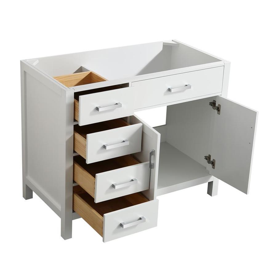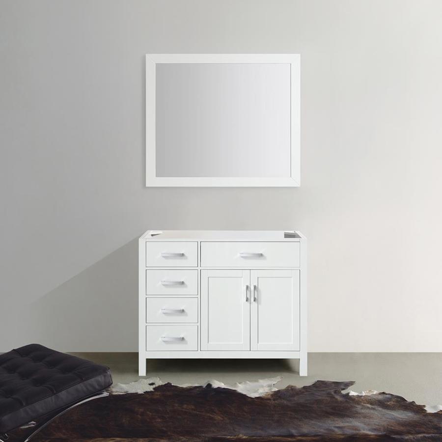 42 in. W x 21.5 in. D x 34.5 in. H Solid wood frame with MDF panels White painted finish 2 soft-closing doors with adjustable hinges so you'll never have to worry about hearing a door slam 4 soft-closing drawers with under-mount drawer glides to meet all your storage needs and 1 decorative faux drawer to complete the look Dove-tail construction drawer boxes for additional strength and stability Polished chrome finish hardware included Open back for easier installation Included: fully assembled base cabinet, hardware, mirror