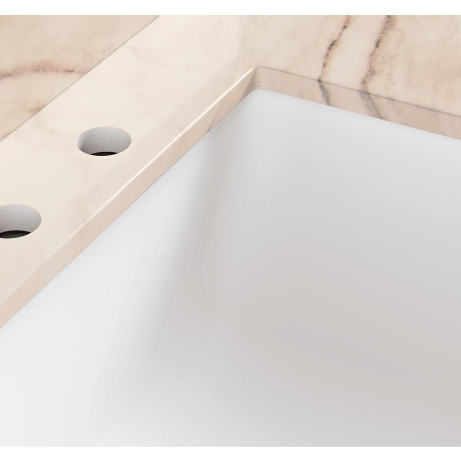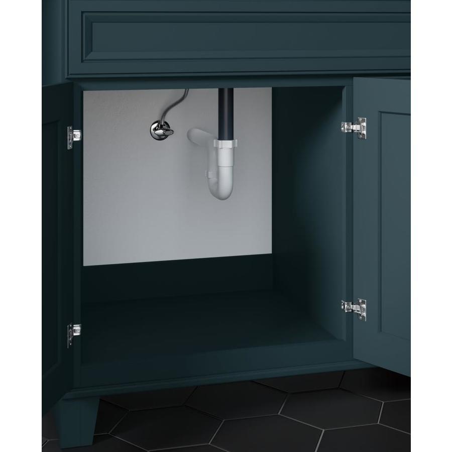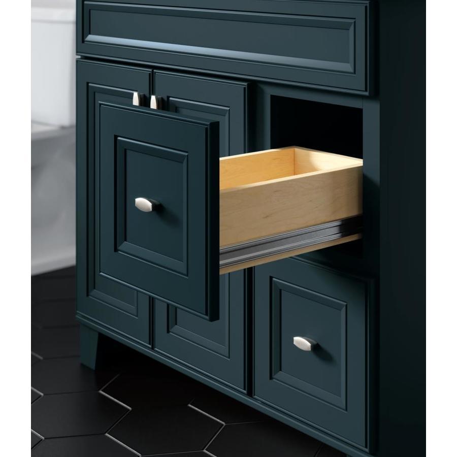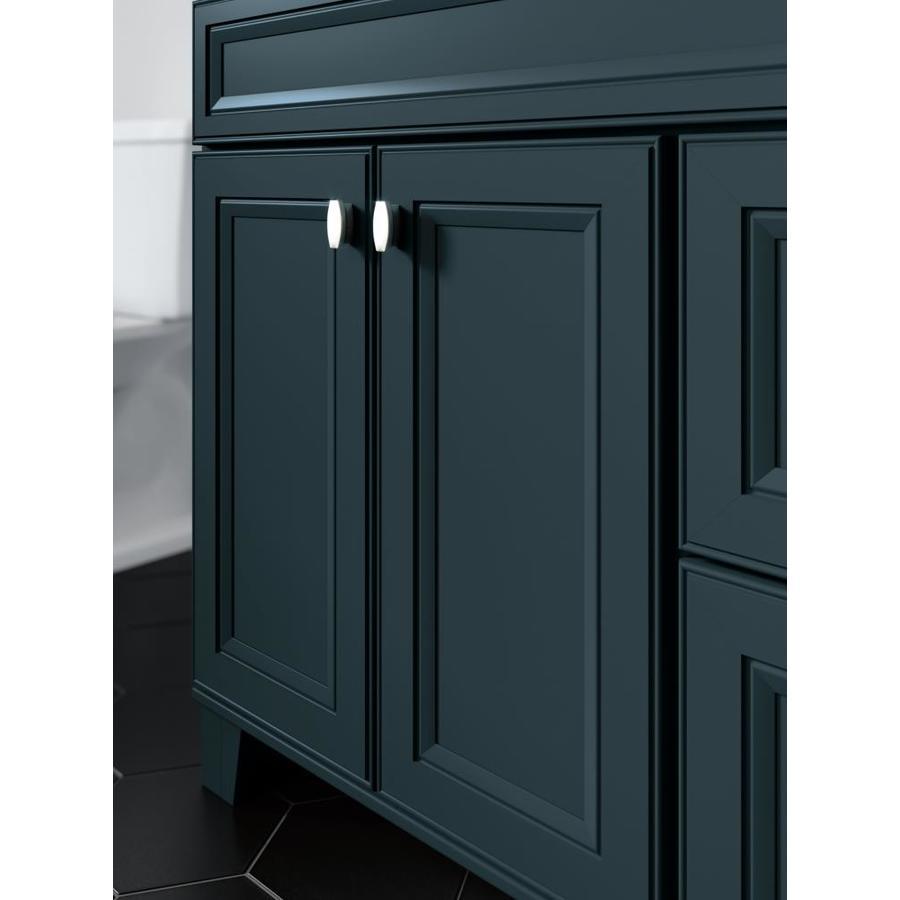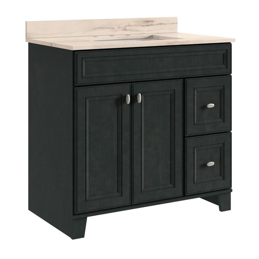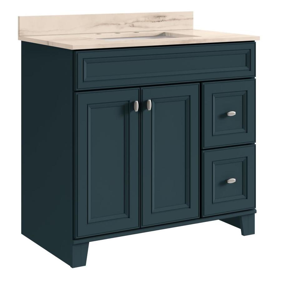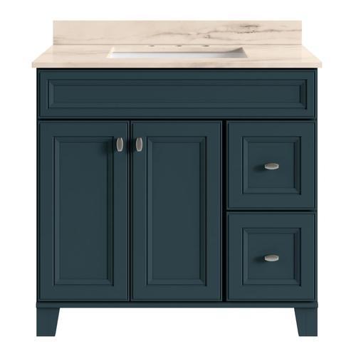 Maritime finish with a transitional profile and valance toekick 37-In W x 22-in D x 38.75-in H vanity, perfectly sized for any bathroom Features 2 full extension drawers and a cabinet door Brushed-nickel finish hardware adds a touch of shine Premium engineered marble Cottonwood vanity top blends well with most bath decor Pre-drilled 8-in widespread faucet holes for easy faucet installation 3.5-In high backsplash included to help protect walls from water damage Features a centered single rectangular white undermount bowl Coated surface that makes the vanity top resistant to stains, bacteria, mold and mildew