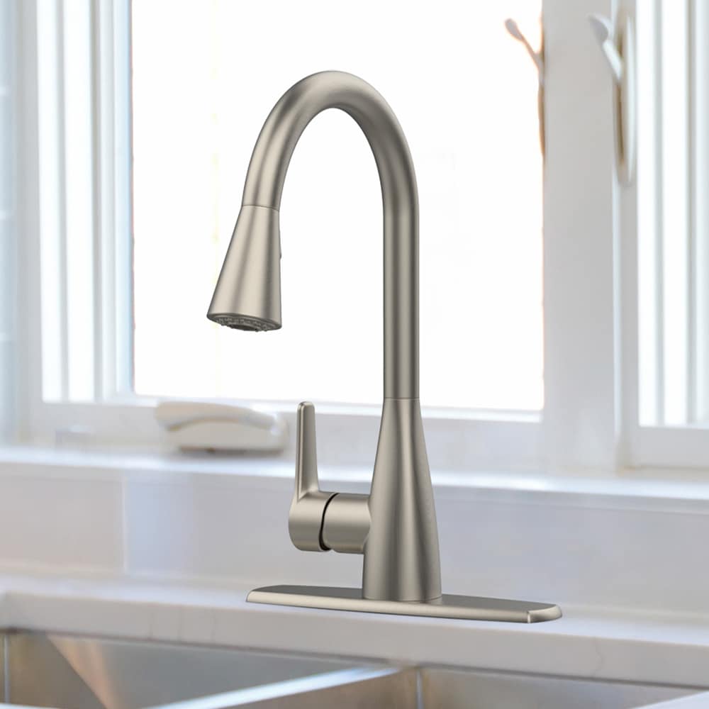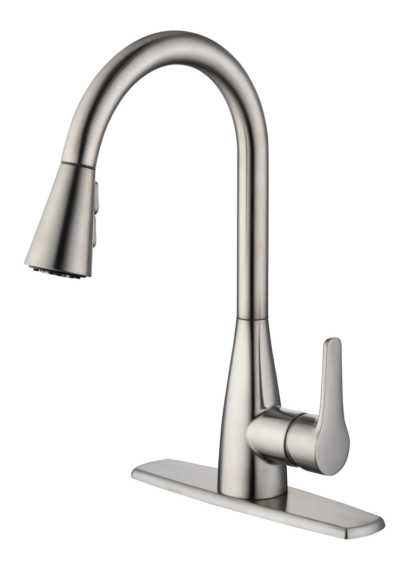 Upgrade your sink with the Project Source Ellesburg pull-down kitchen faucet in brushed stainless steel. A single lever controls a ceramic disc valve for smooth, drip-free operation, while the included deck plate lets you install on 1- or 3-hole sinks.