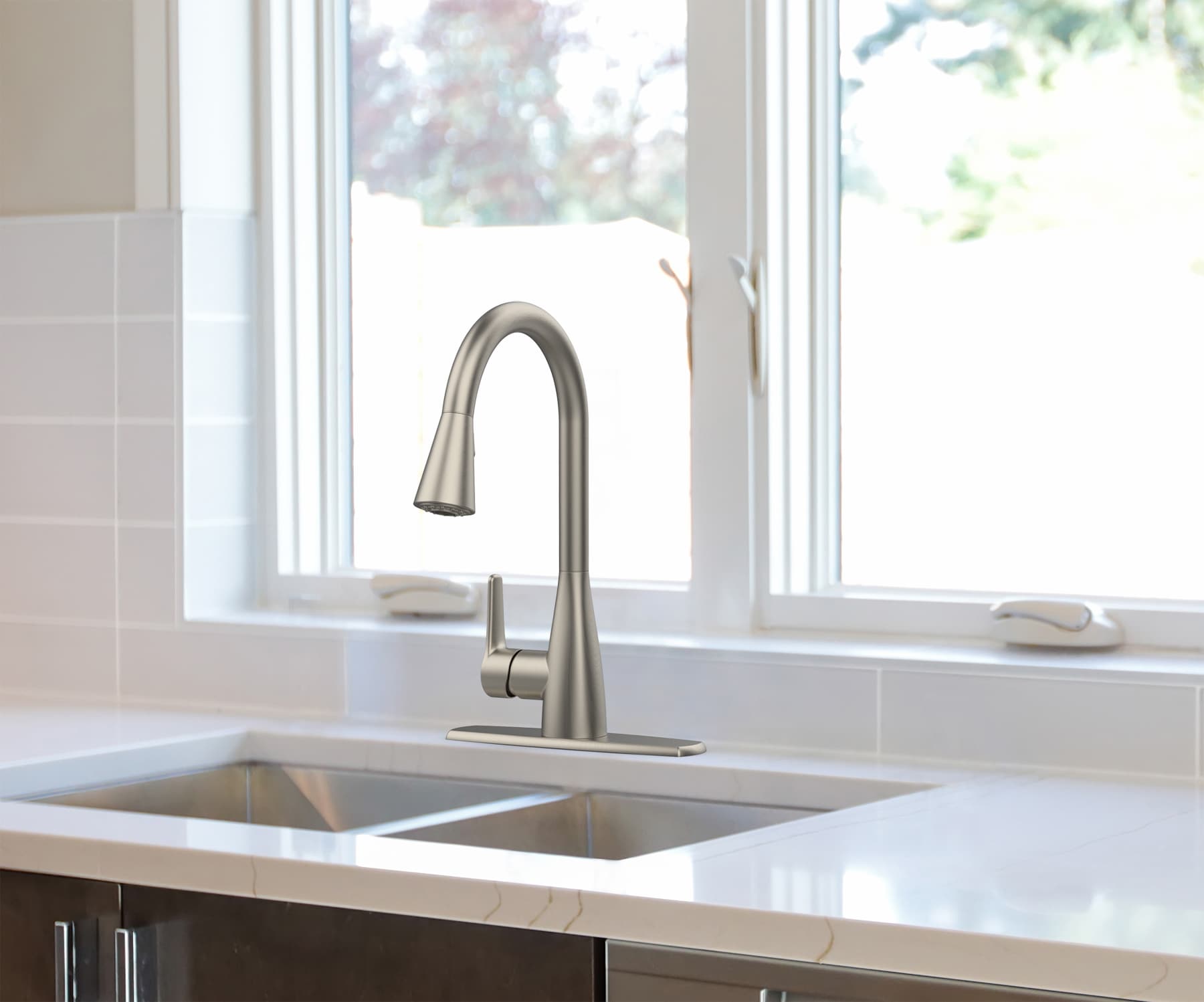Ellesburg’s brushed stainless silhouette curves with an elegant restraint, instantly refining the kitchen landscape. The tapered pull‑down head and sculpted single lever feel tailored—subtle details that elevate daily tasks. Style it against crisp white tile or warm wood cabinetry to let the satin finish glow softly. It’s a polished essential that marries performance with effortless, modern luxury.
