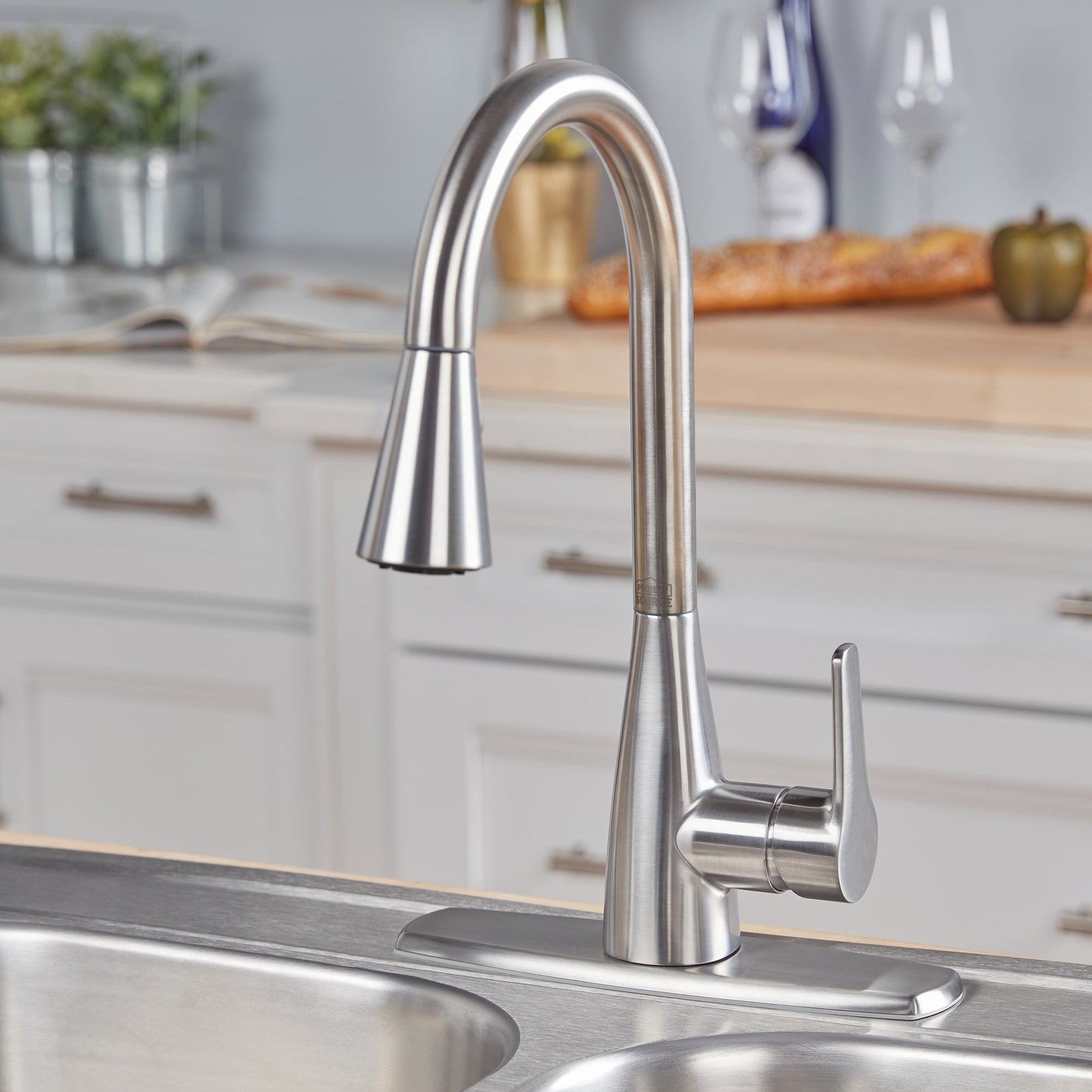 Project Source Ellesburg Stainless Steel 1-Handle Deck-Mount Pull-Down Kitchen Faucet with Sprayer (Deck Plate Included)