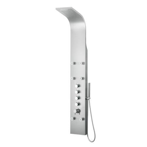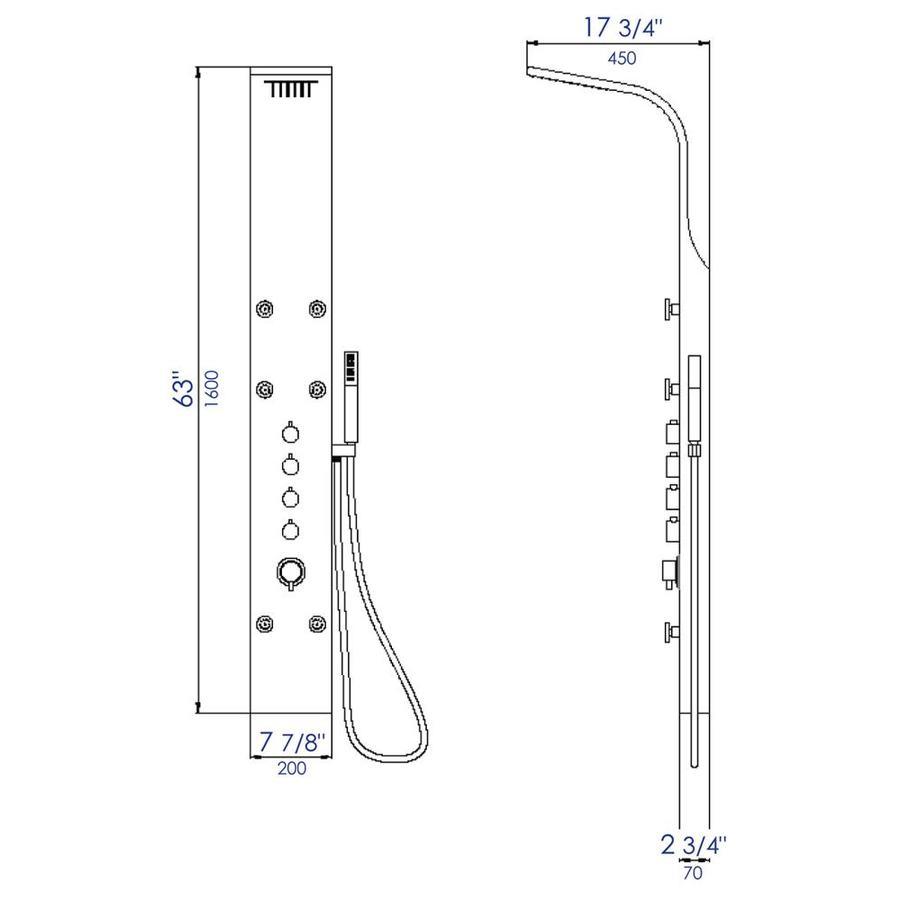 This complete set comes with everything you need for the shower so you don't have to go around buying separate parts (valve, body spray, head, arm, handheld) Quick, easy, and low cost installation onto any wall type. There's no need to break the wall to run pipes and install each piece separately. All you need is hot and cold water supply lines in the wall behind where you want to install the panel Sleek Stainless Steel panel with Polished Chrome handles and knobs Enjoy a customized shower experience with a volume control shower mixer valve and adjustable body sprays 6 adjustable round body jets Overhead rain shower for ultimate relaxation Handheld sprayer with 60 inch reach Flexible reinforced stainless steel hot and cold water supply hoses with standard 0.5 inch connection
