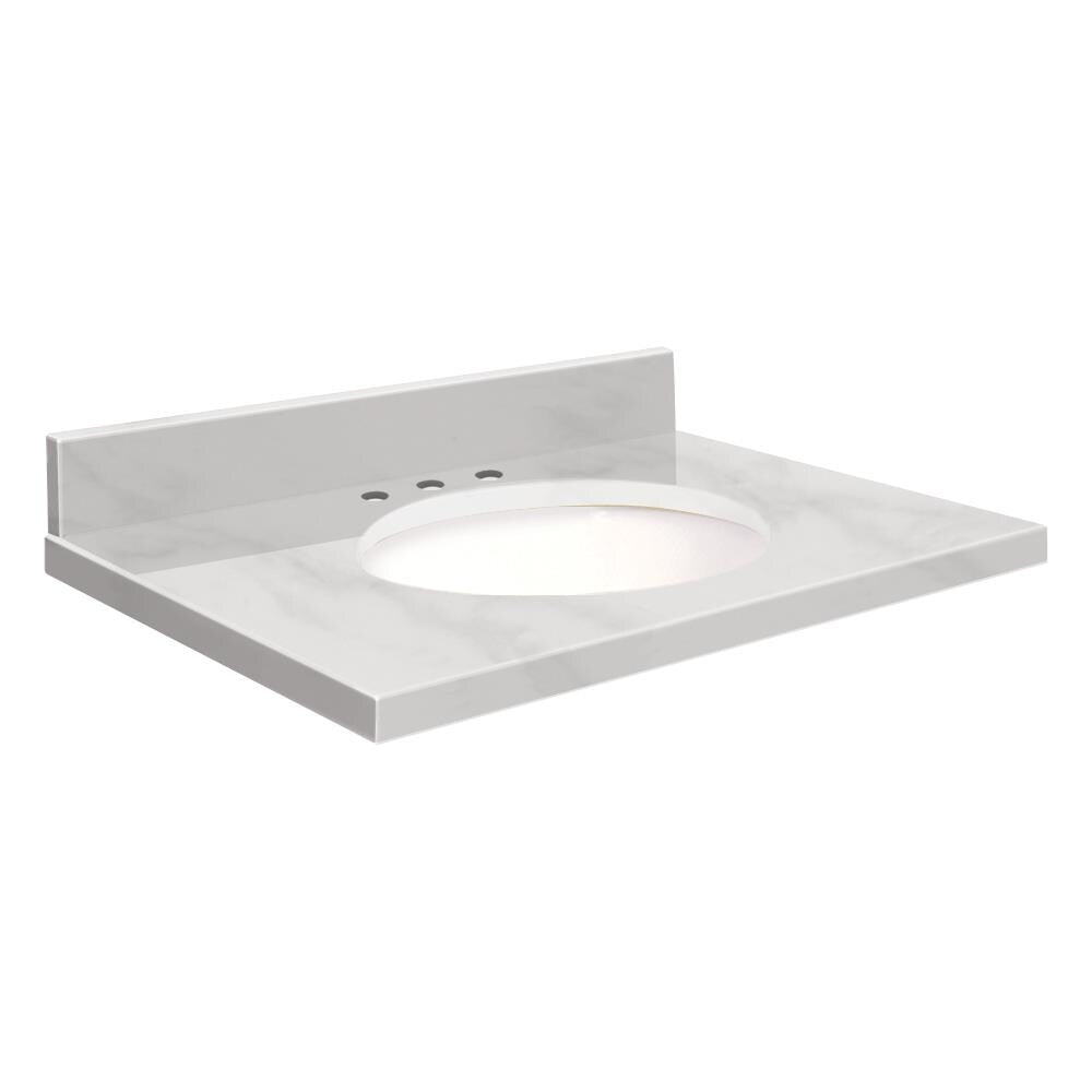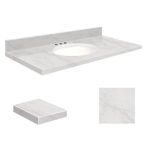 Elevate your bath with a 37-in Transolid vanity top crafted from 1-1/4-in thick natural White Carrara marble. Pre-sealed for durability, it includes a matching 4-in backsplash and a center oval undermount vitreous-china sink with overflow.