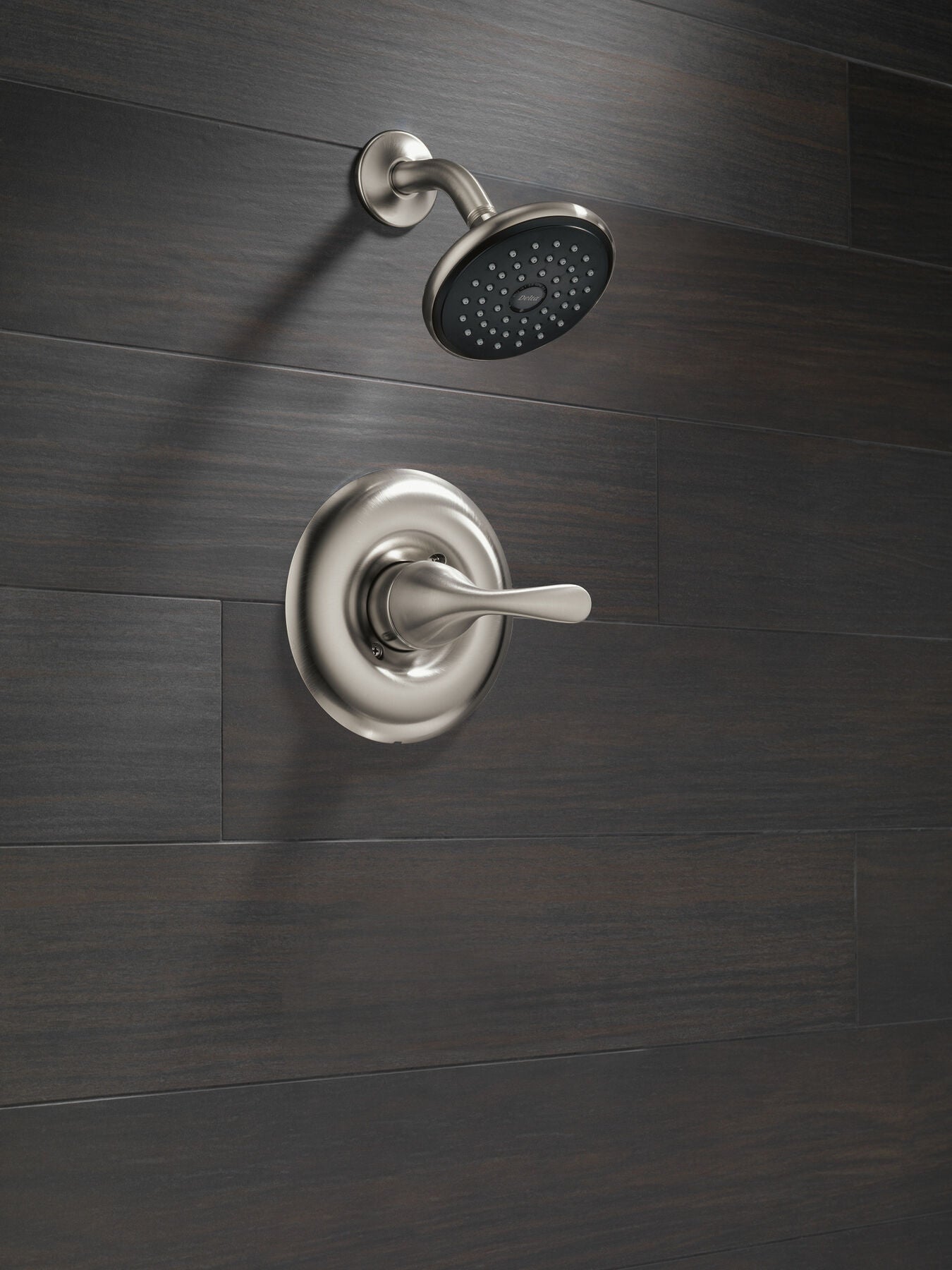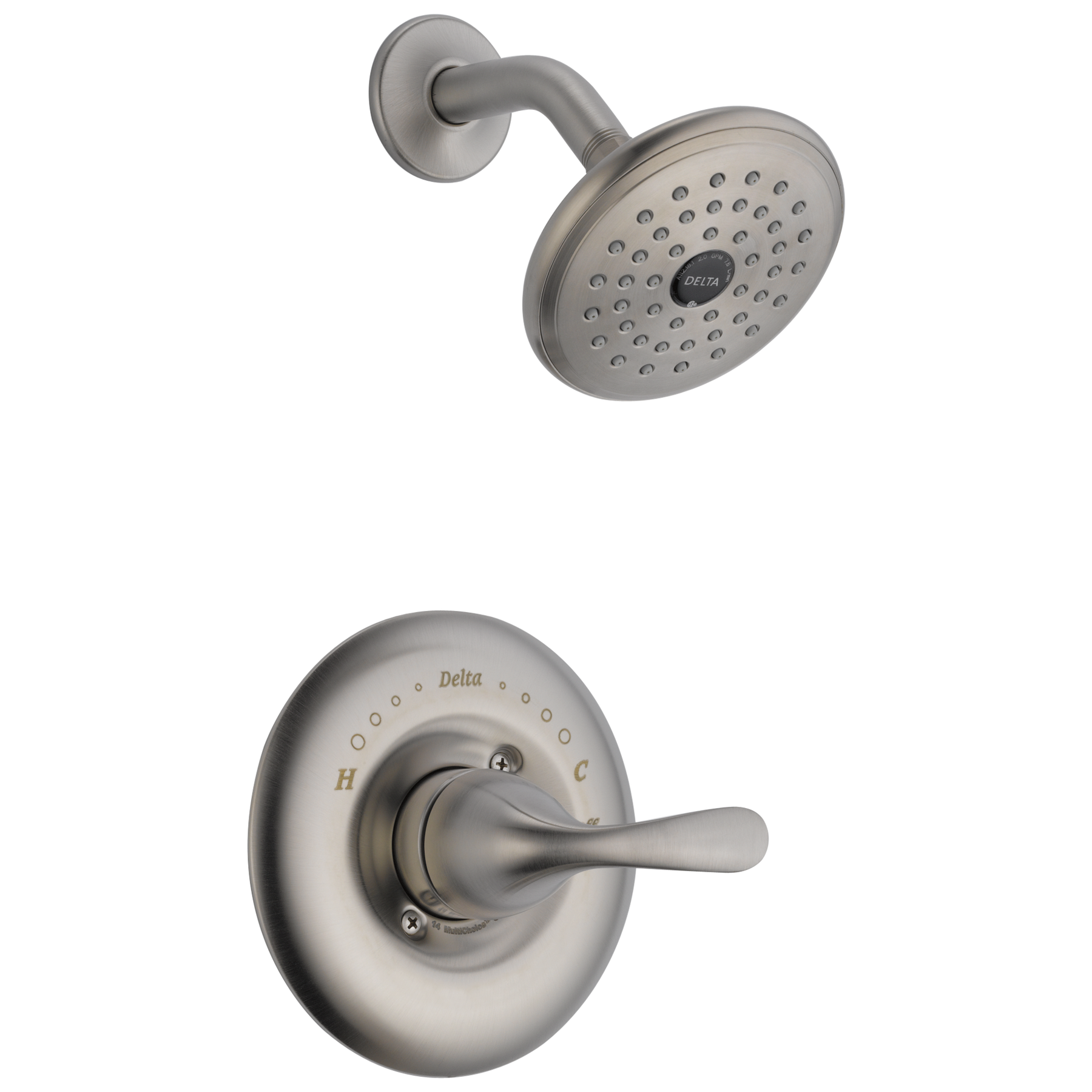 This Delta 1-handle shower faucet in Classic Stainless pairs a full-body spray showerhead with a pressure-balanced valve for reliable temperature control. Touch-Clean rubber spray holes wipe clean easily, and the WaterSense label helps cut water use without sacrificing performance.