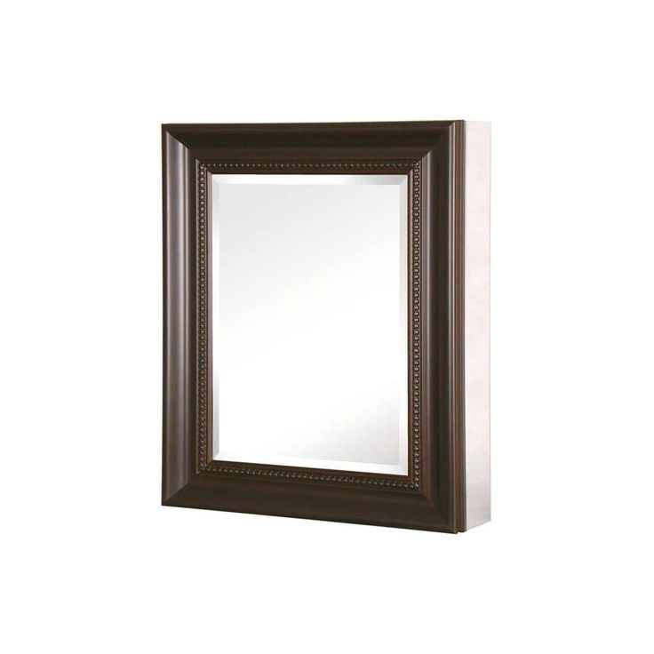 A: This cabinet features a rust-free aluminum case with a mirror back and an oil-rubbed bronze door frame.