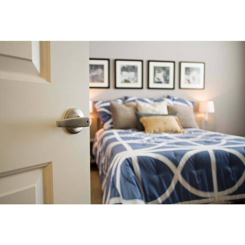 Streamlined, straight lever shape of the Delavan is perfect for an updated look. This privacy lever is designed for bedrooms and bathrooms, locking with a turn button on the inside and not requiring a key. 2-way latch that is adjustable from 2-3/8 in. up to a 2-3/4 in. backset. Full 1/2 in. throw, nickel plated.
