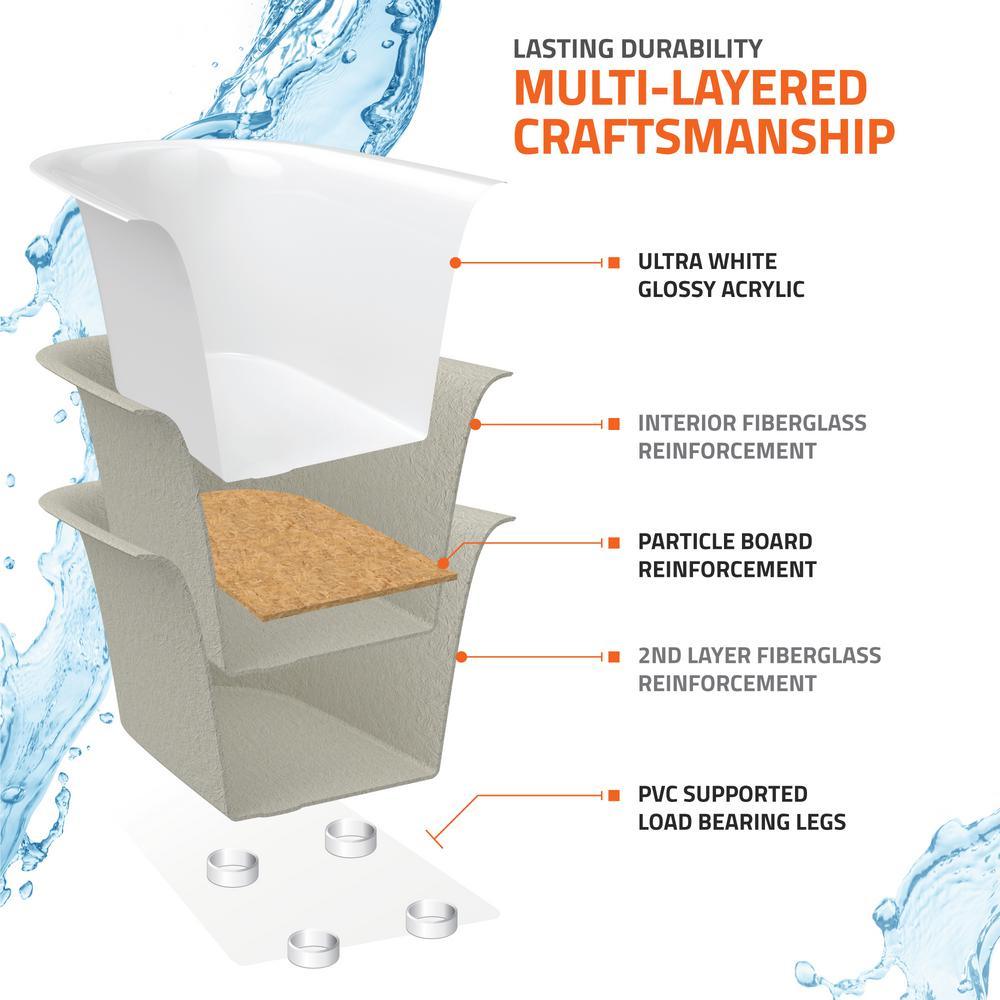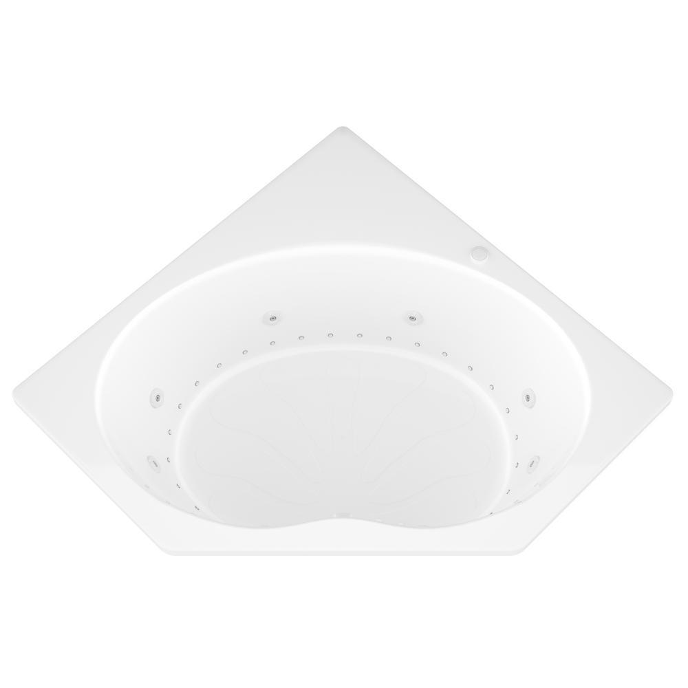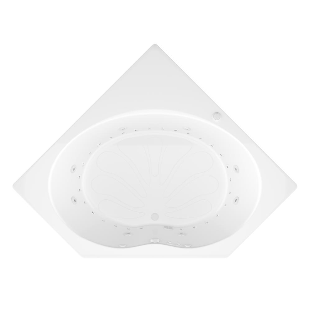 A luxurious corner drop-in tub crafted in glossy white acrylic with fiberglass reinforcement, combining whirlpool and air jet therapies for a full-body massage. Center drain, manual controls, and an included maintenance heater keep water warm while 29 air jets and adjustable hydro jets deliver soothing relaxation.