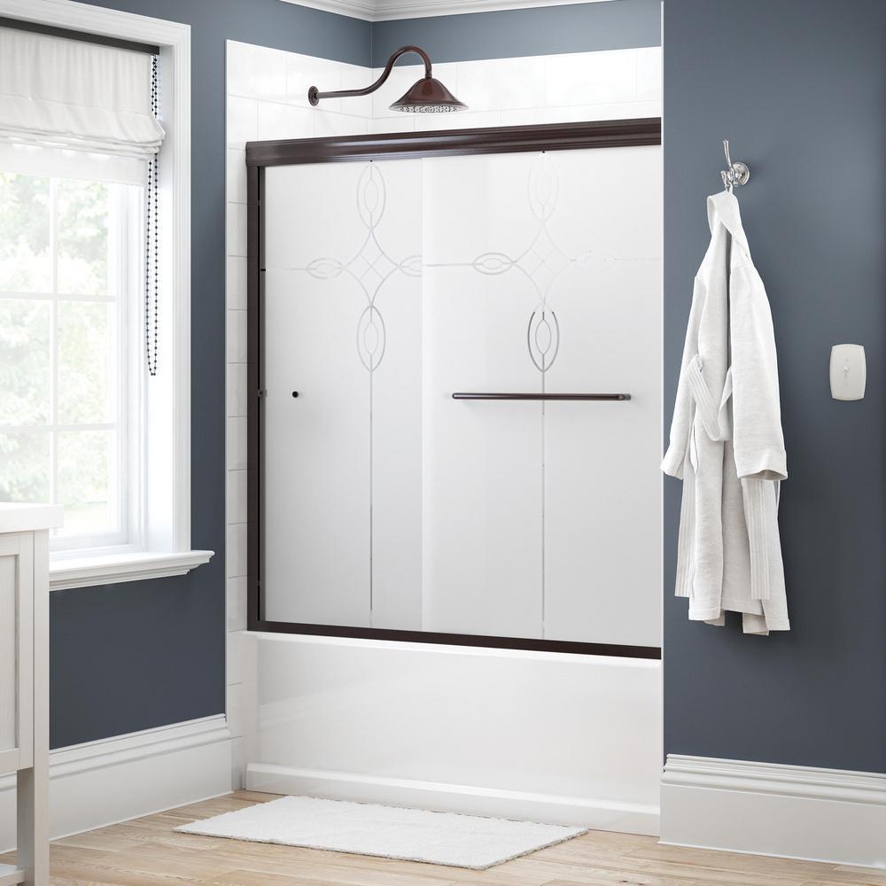 Whether you’re looking for a moderate DIY project or working on a bathroom remodel, upgrading your bathroom with a new sliding shower door is easy with the Delta 1-2-3 custom sliding shower door program. Delta’s custom glass shower door program offers 1000s of design combinations by choosing your glass shower panels, shower door track, and shower door handles to build a unique, personalized glass shower door. Simple and classic, the Traditional bathtub door track in bronze features a reversible top track with two unique profiles that offer uncompromised quality and value with a design that’s familiar and balanced. Make a statement with standard 1/4 in. ANSI certified tempered glass shower panels, featuring a mainly smooth and frosted surface with a traditional design element that’s luxurious and relaxing. The Simplicity sliding shower door handle with knobs features a convenient towel bar for extra bathroom storage and two interior knobs for extra showering space in a simple design silhouette that beautifully combines form and function.