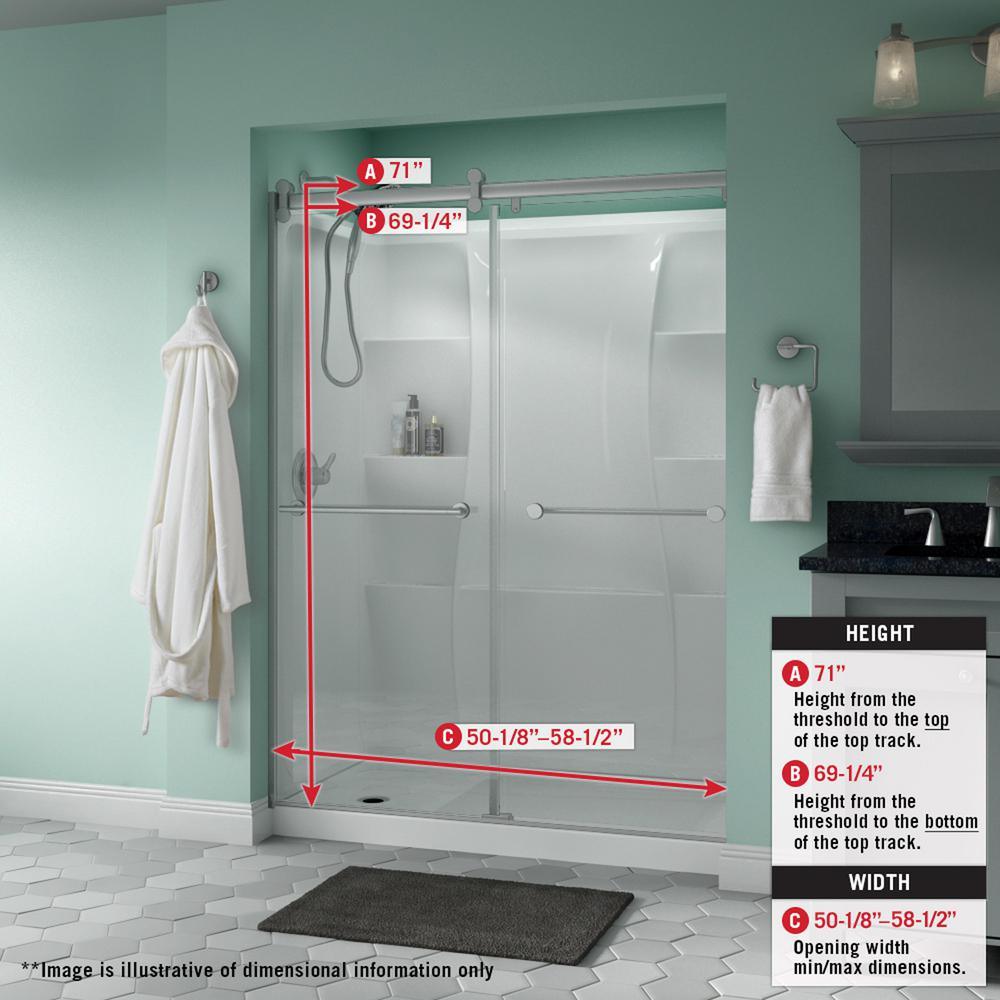 • This custom shower door fits openings with a 50-1/8 in. minimum to 58-1/2 in. maximum (127-149 cm) and a 58-3/4 in. height (149 cm) height, offering a walk-in width of 18-1/2 in. to 27 in. (47-69 cm)