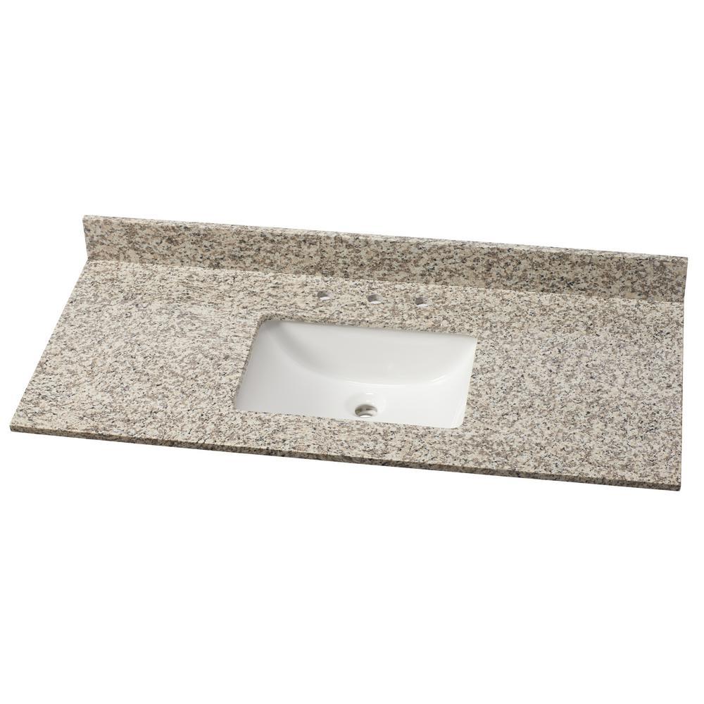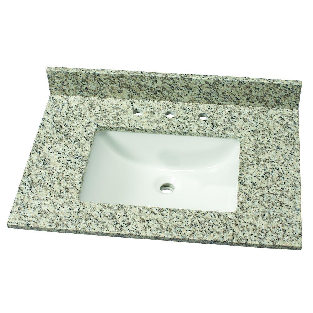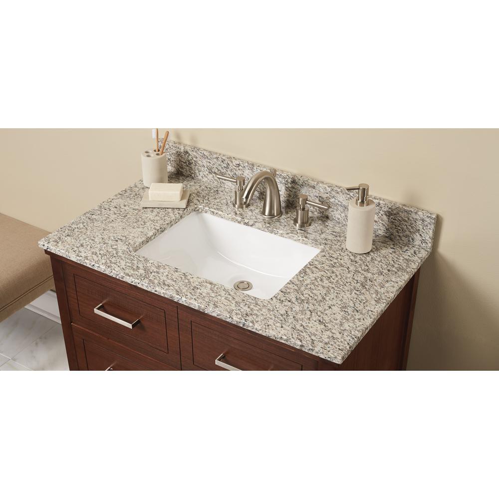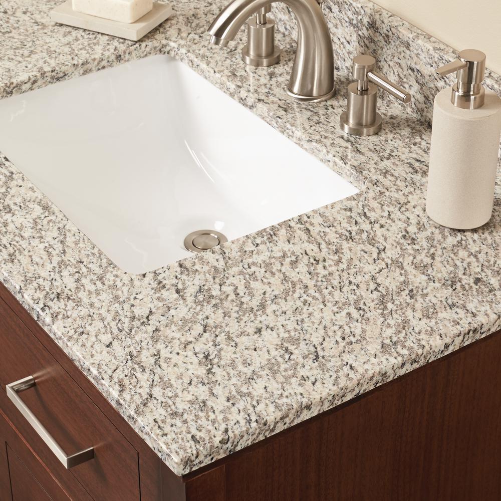 Elevate your style with Blanco Perla Granite vanity top and attached under-mount vitreous-china sink. A warm blend of creams, taupe’s and browns, Blanco Perla Granite offers the perfect neutral palette to complement any design style. Ideal for various installs, this vanity top is the perfect solution for quick and easy remodels. Note: Digital photographs are not fully representative of the final product and do not exhibit all the characteristics of a design. Variations in color, pattern, size, shape and shade are inherent and unique characteristics of an engineered marble and it is to be expected with this product. Performance of the material is not affected by these variations and do not qualify for product replacement. All stone can be damaged by force and no stone is chip proof. Objects hitting edges particularly at sinks may cause chips. Surfaces can be damaged by sudden and/or rapid change of temperature, especially near the edges, as well as direct and/or sustained heating of top.