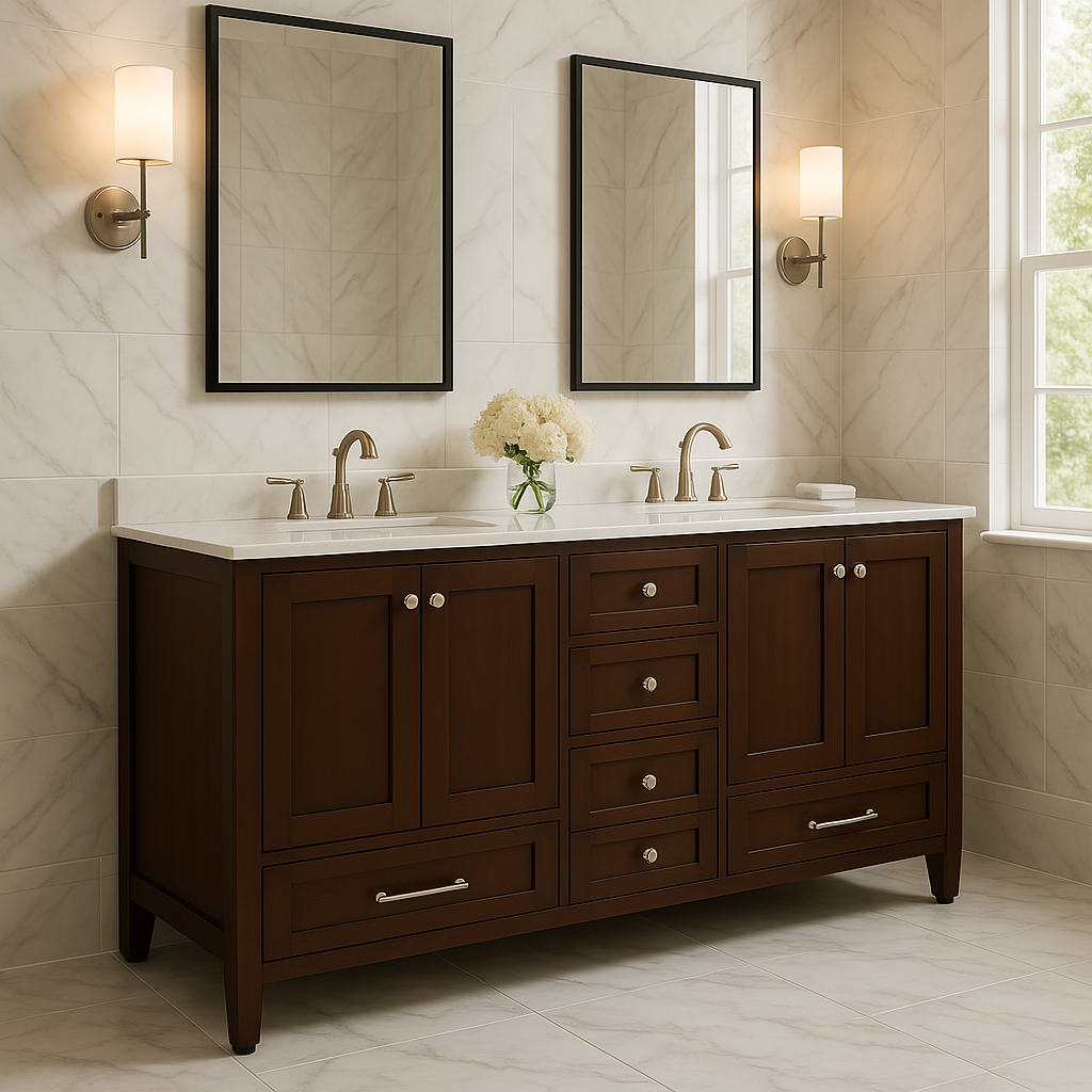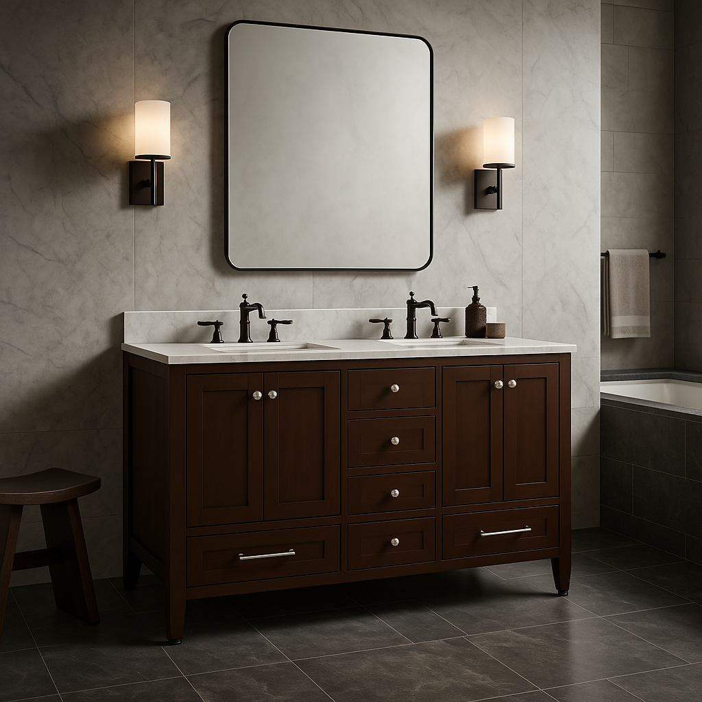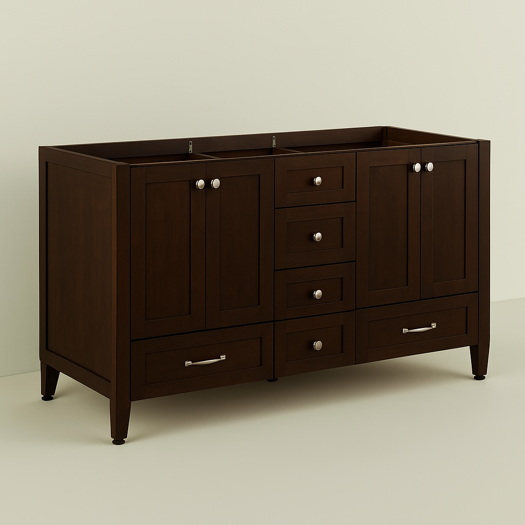 The Claxby 60-Inch Bathroom Vanity in Chocolate combines elegant design with practical features, offering ample storage and a sophisticated look for your bathroom.