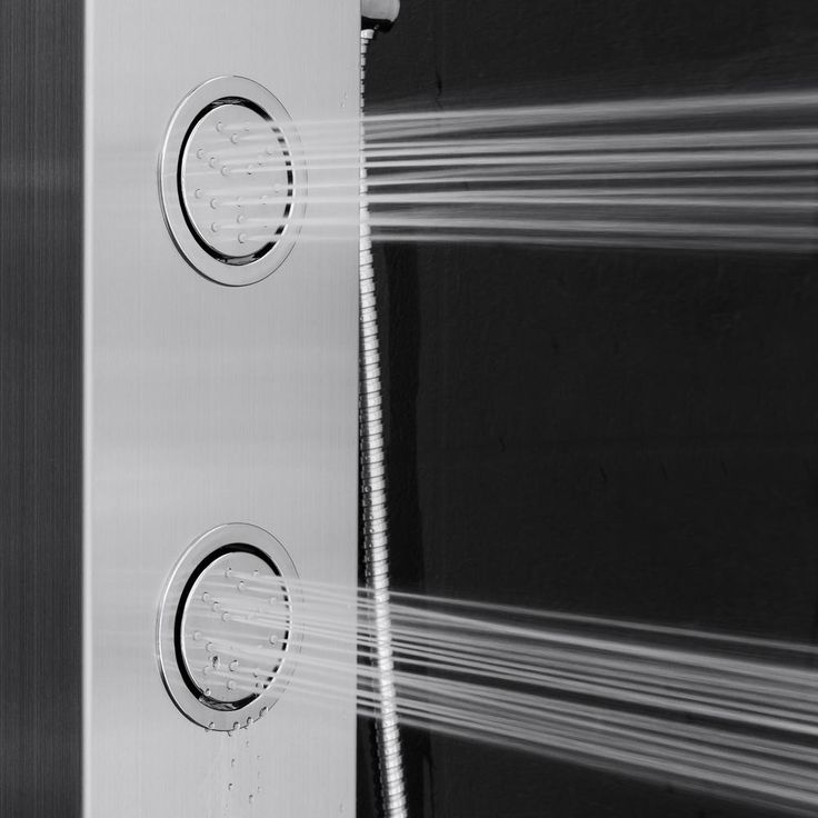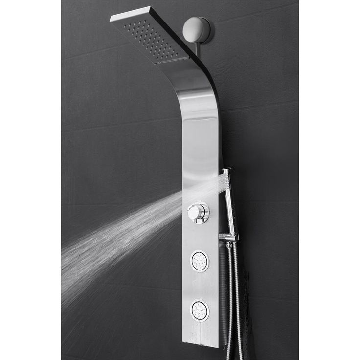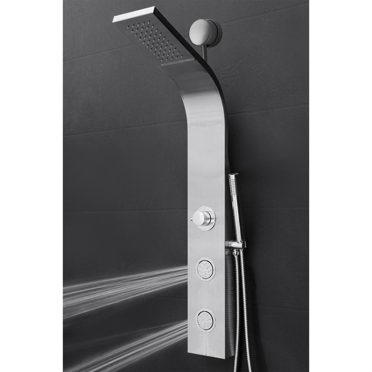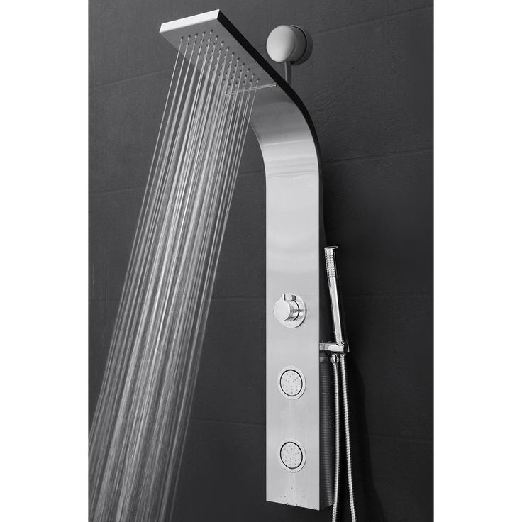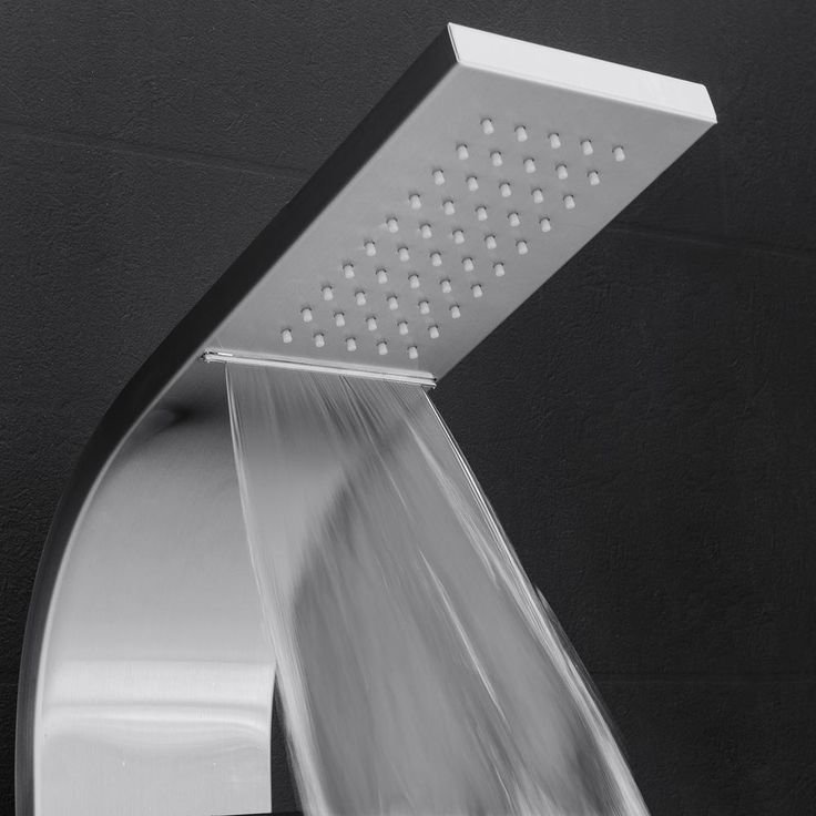 • Slimline luxury shower panel has built-in rainfall waterfall showerhead, high-powered body spray jets, and high-efficiency handheld shower wand