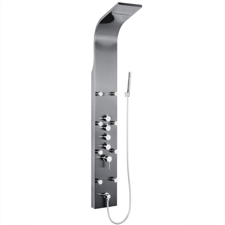 • Slimline luxury shower panel has built-in rainfall waterfall showerhead, high-powered body spray jets, and high-efficiency handheld shower wand