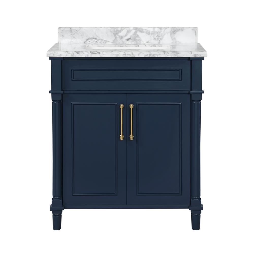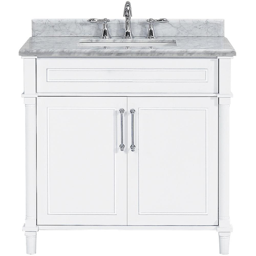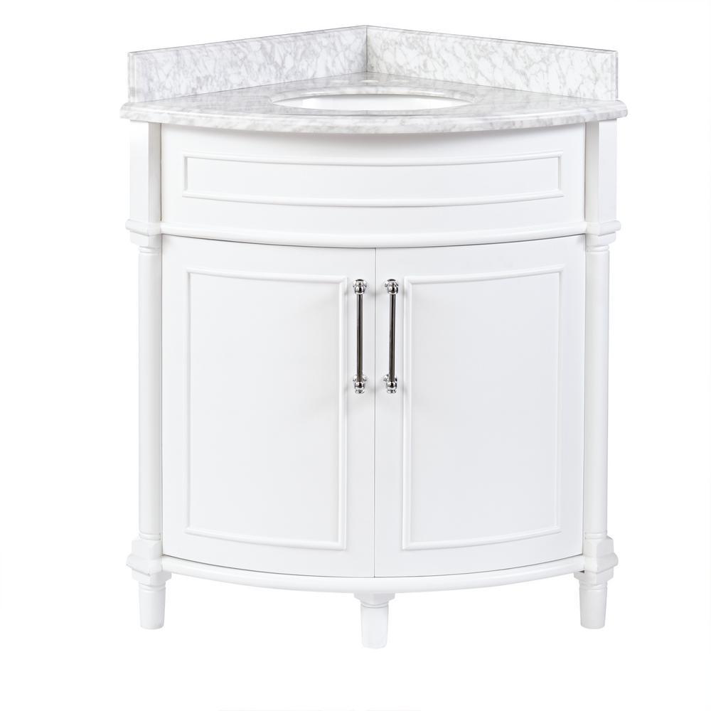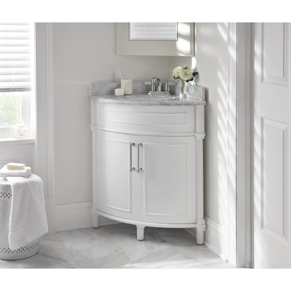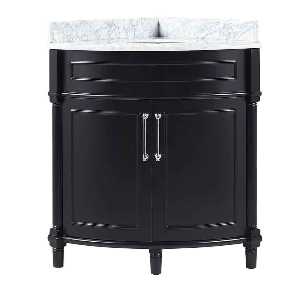 Let the Aberdeen 32 in. Corner Vanity with white marble top and backsplash add a bit of class to your bathroom decor. This modern vanity comes with a beautiful white ceramic basin and two soft closing storage cabinet doors.