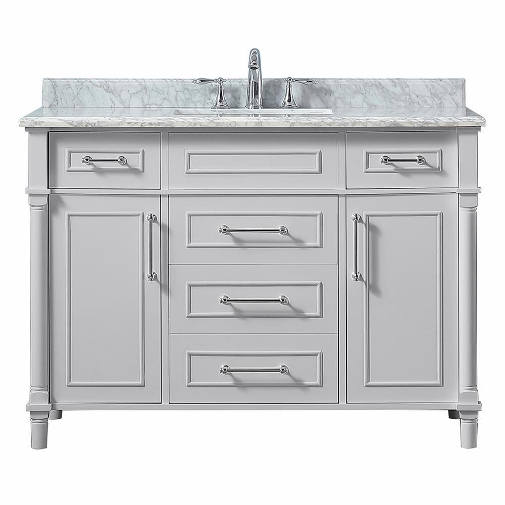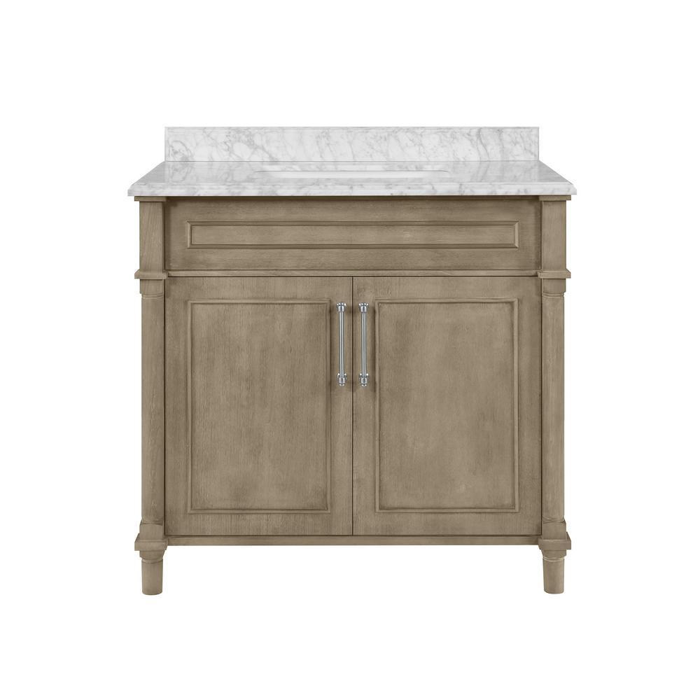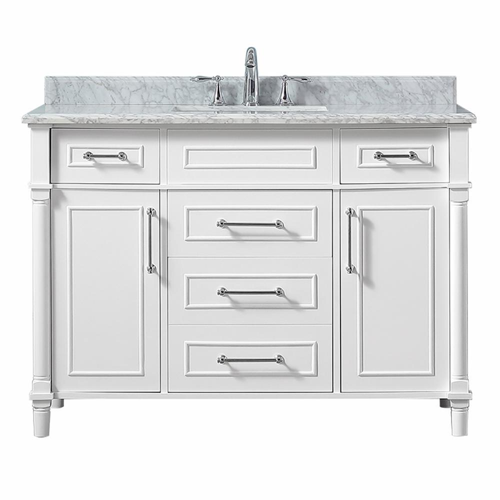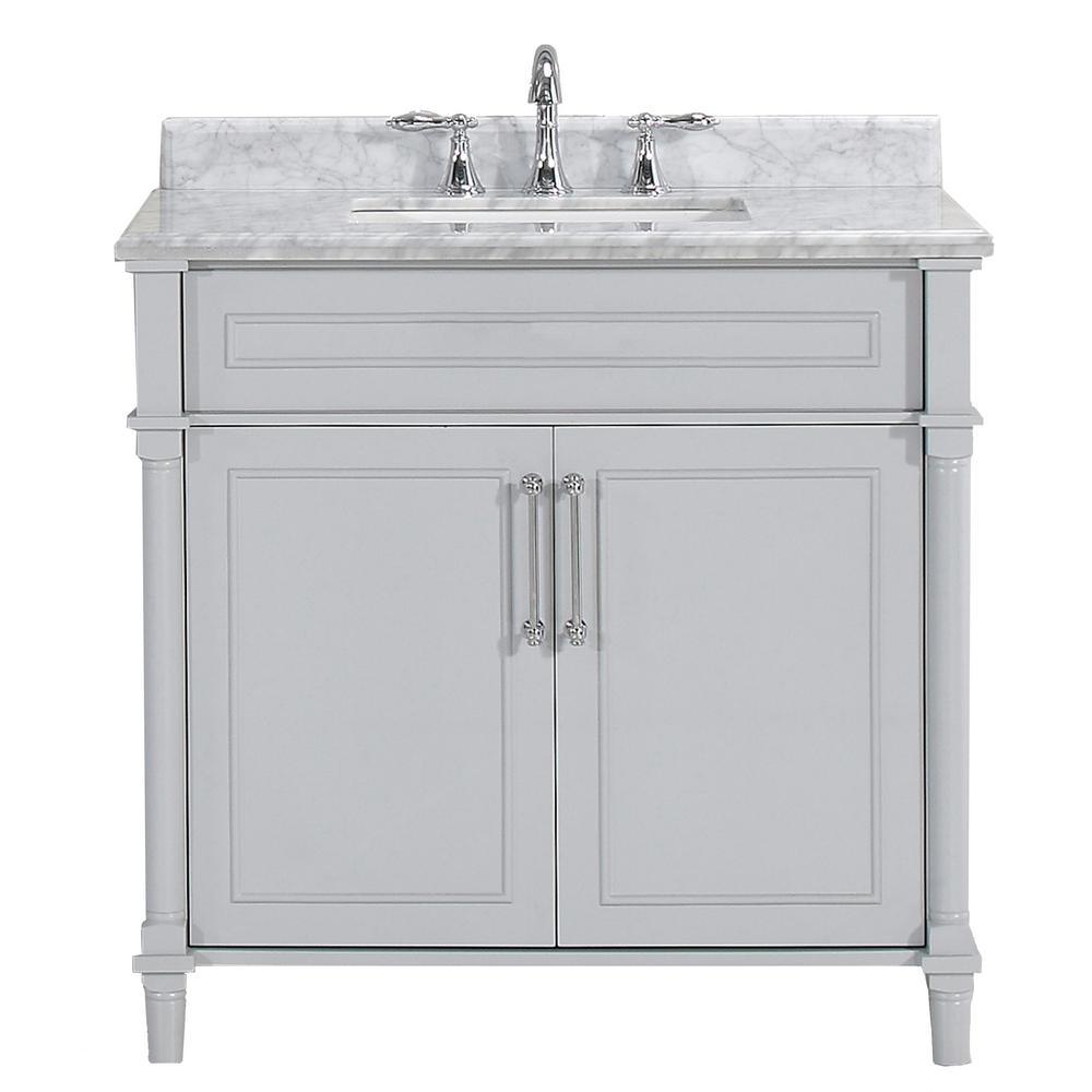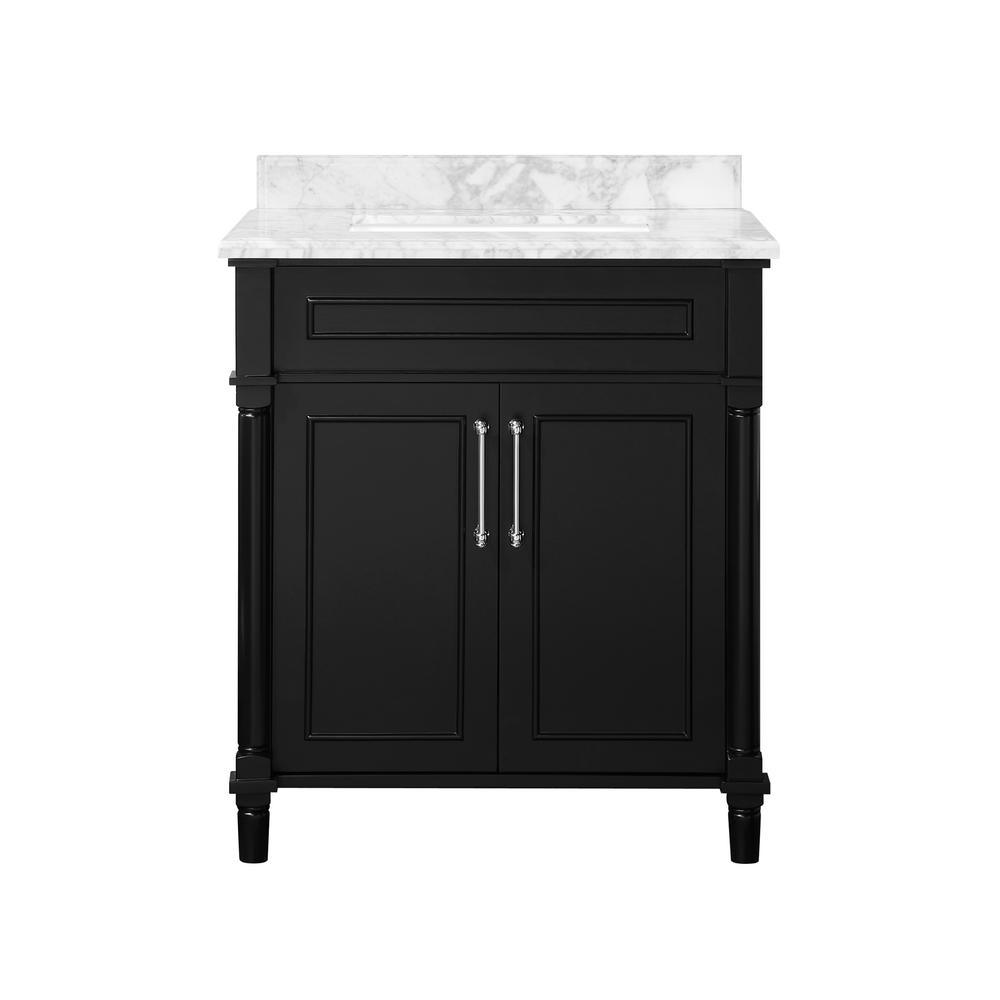 Let the Aberdeen 32 in. Corner Vanity with white marble top and backsplash add a bit of class to your bathroom decor. This modern vanity comes with a beautiful white ceramic basin and two soft closing storage cabinet doors.