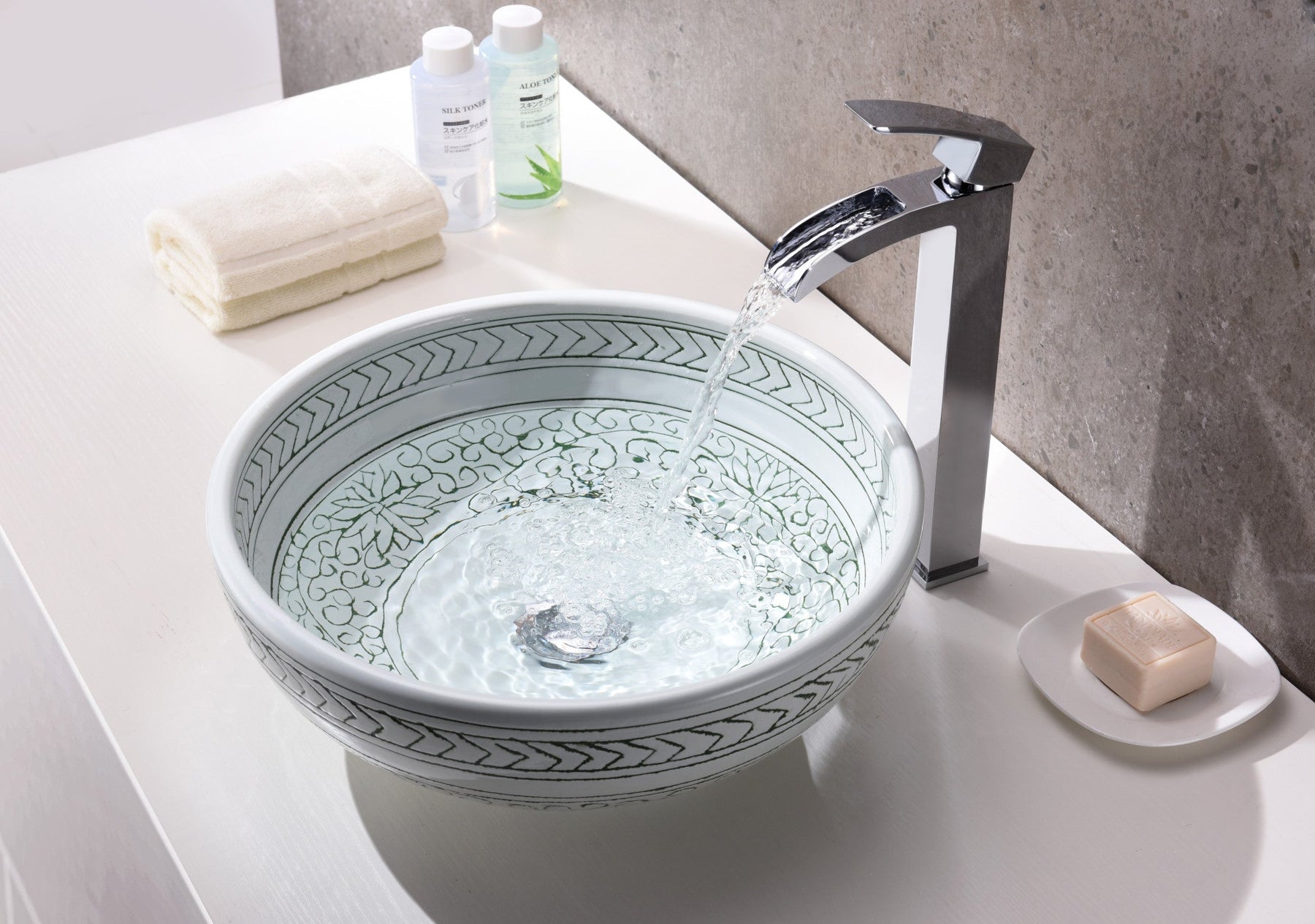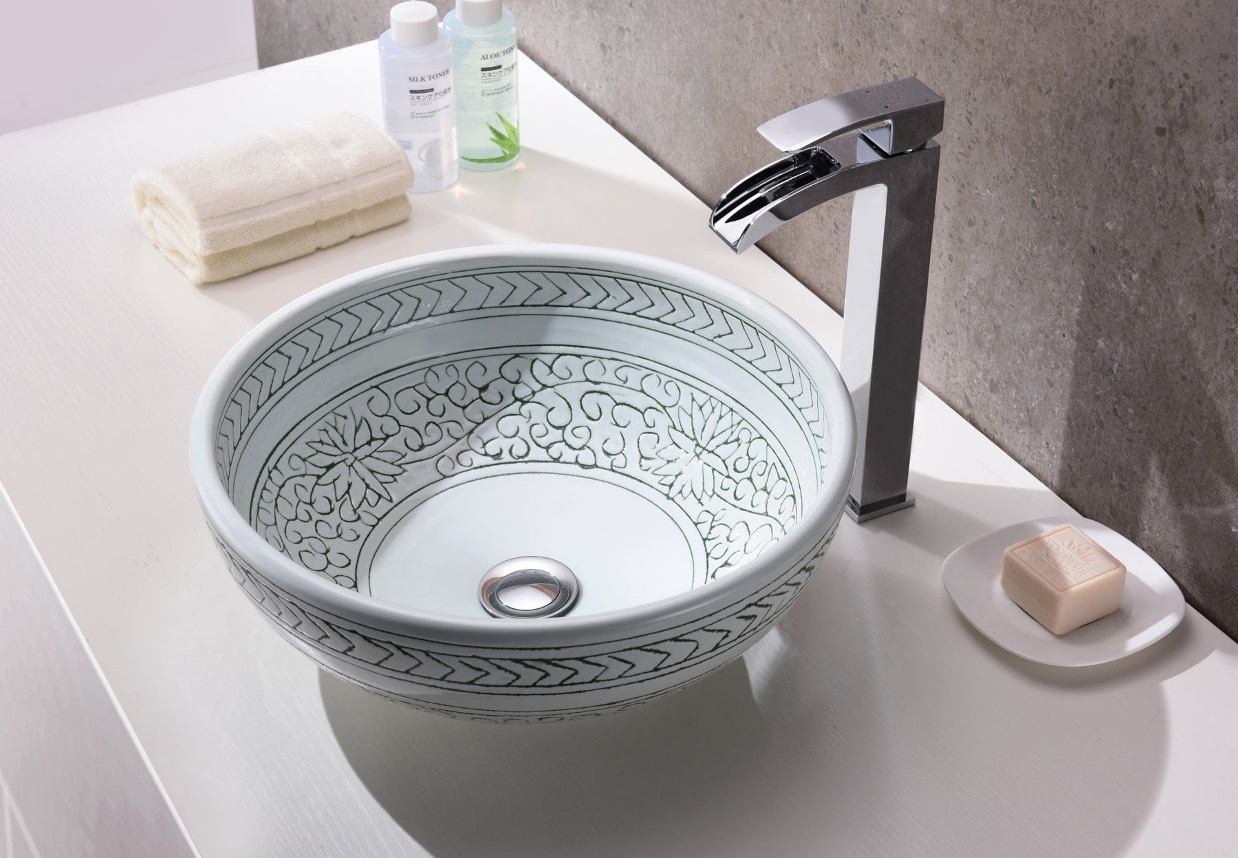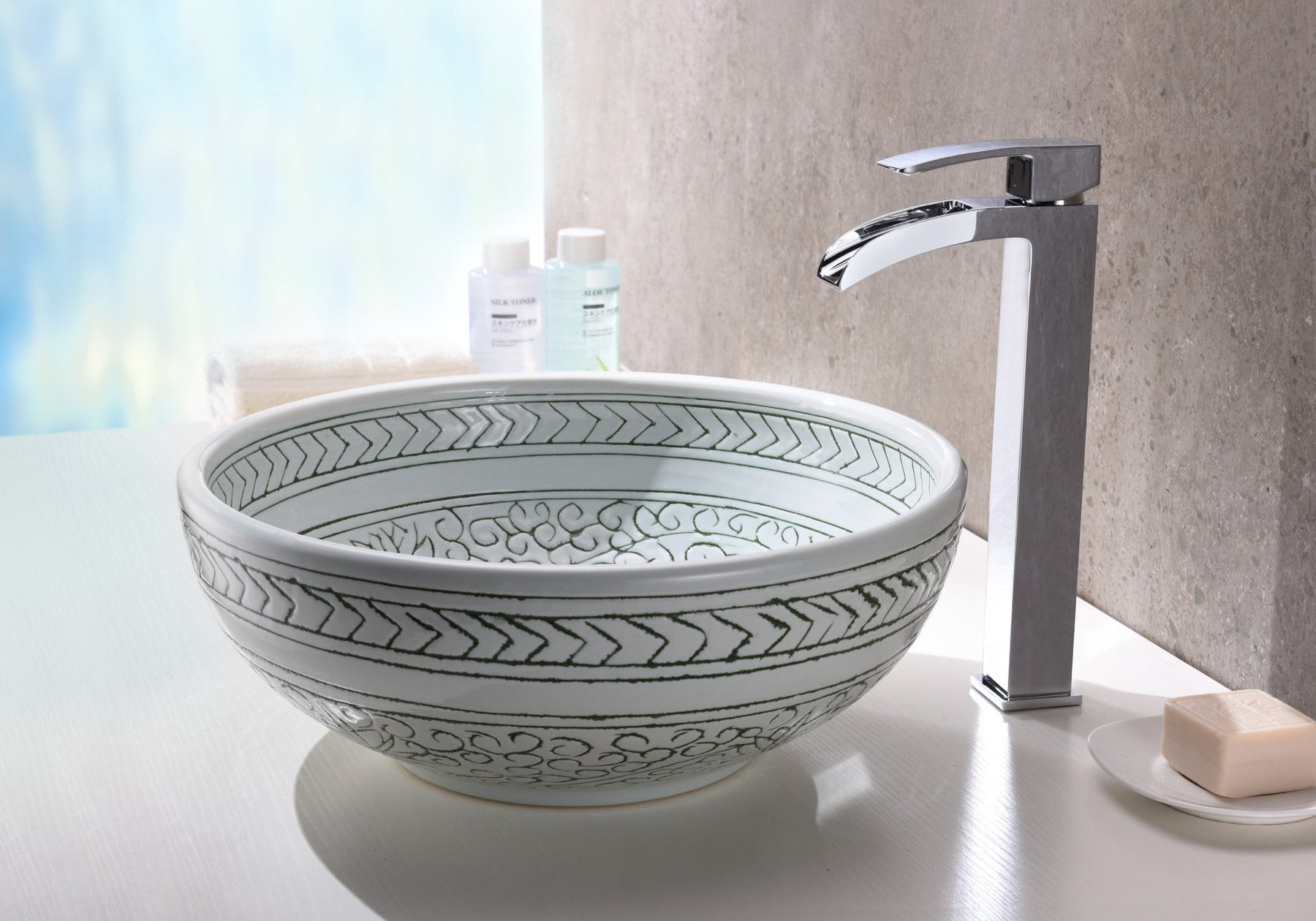 This vessel sink brings a poetic rhythm to the vanity—its etched Décor White pattern feels tailored yet effortlessly chic. The tempered Deco‑Glass has a luminous quality that bounces light and elevates everyday rituals. Pair it with a tall, polished chrome faucet and a honed stone counter to let the motif sing. It’s a refined essential that whispers luxury in any bath setting.