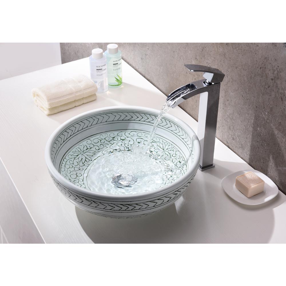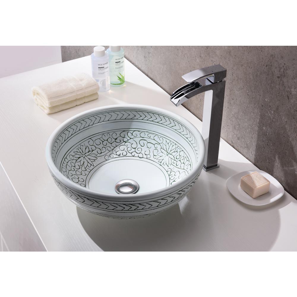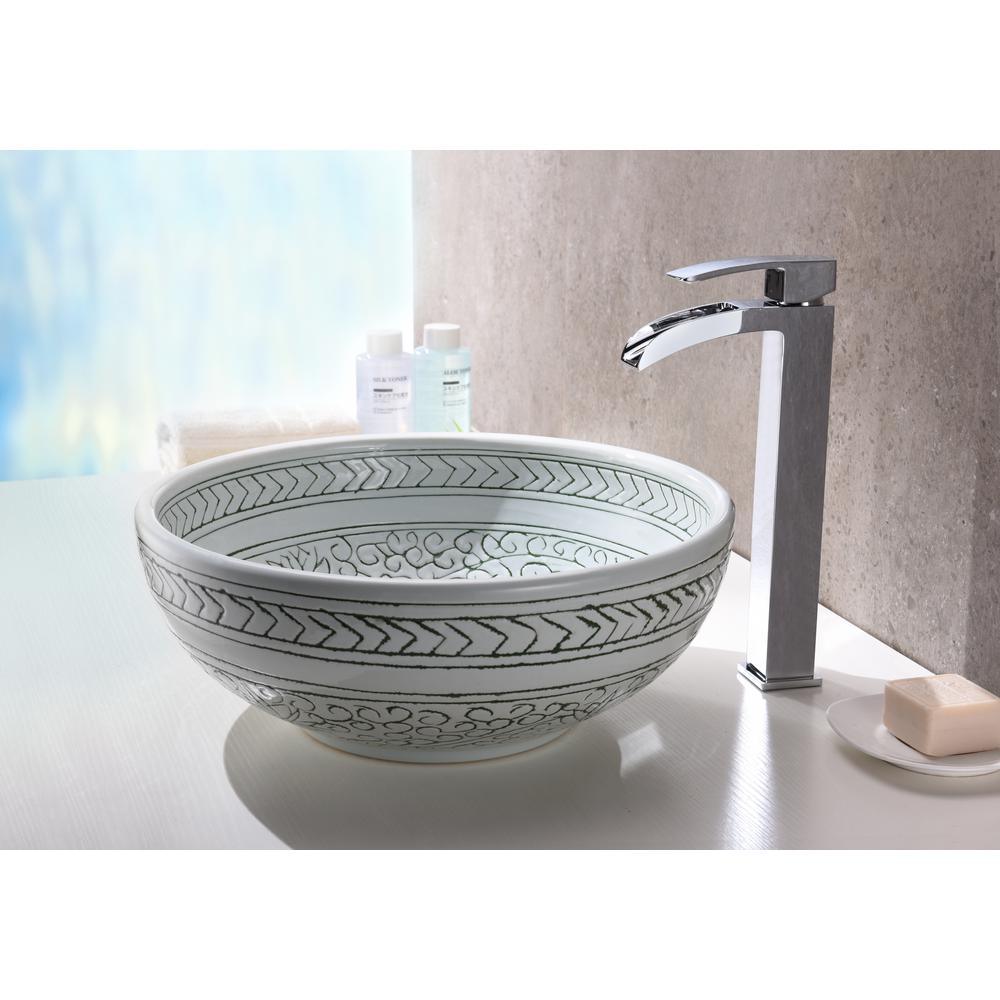 This vessel sink brings a poetic rhythm to the vanity—its etched Décor White pattern feels tailored yet effortlessly chic. The tempered Deco‑Glass has a luminous quality that bounces light and elevates everyday rituals. Pair it with a tall, polished chrome faucet and a honed stone counter to let the motif sing. It’s a refined essential that whispers luxury in any bath setting.