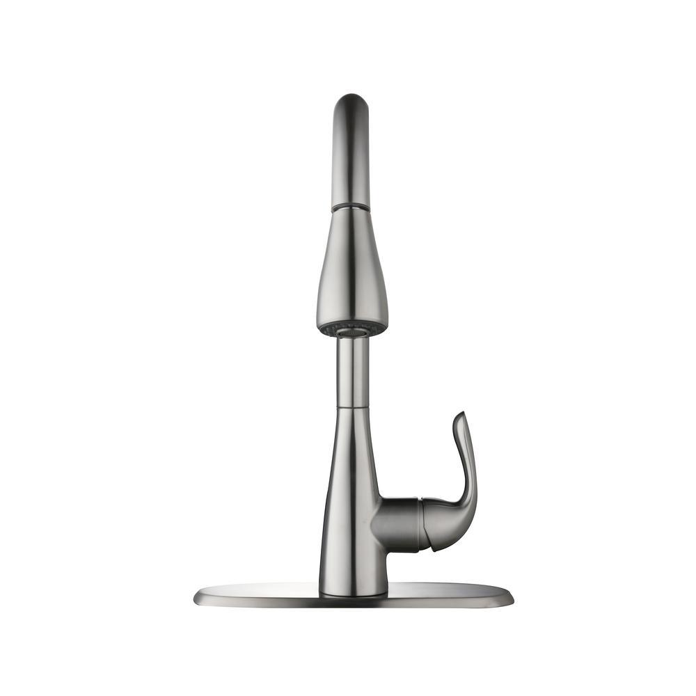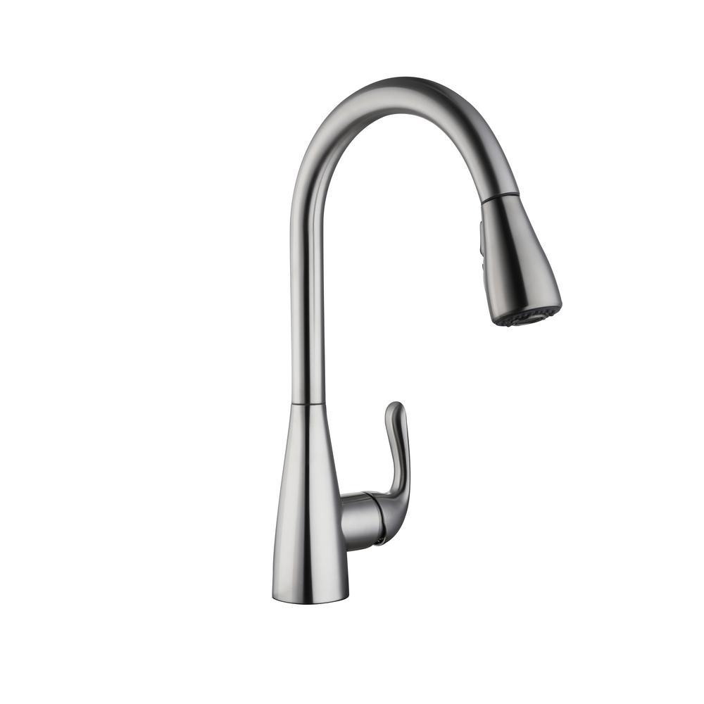 With the simplicity and style to complement any kitchen setting, the Carla Single-Handle Pull-Down Sprayer Kitchen Faucet features a spray head with two modes. Choose between full and aerated sprays for varying cleaning tasks. This kitchen faucet boasts a timeless stainless steel finish to offer modern, contemporary style in your space. With a high-arc, pull-down sprayer, this fashionable faucet boasts an efficient 1.8 GPM water flow rate and includes a ceramic disc valve for drip-free performance.
