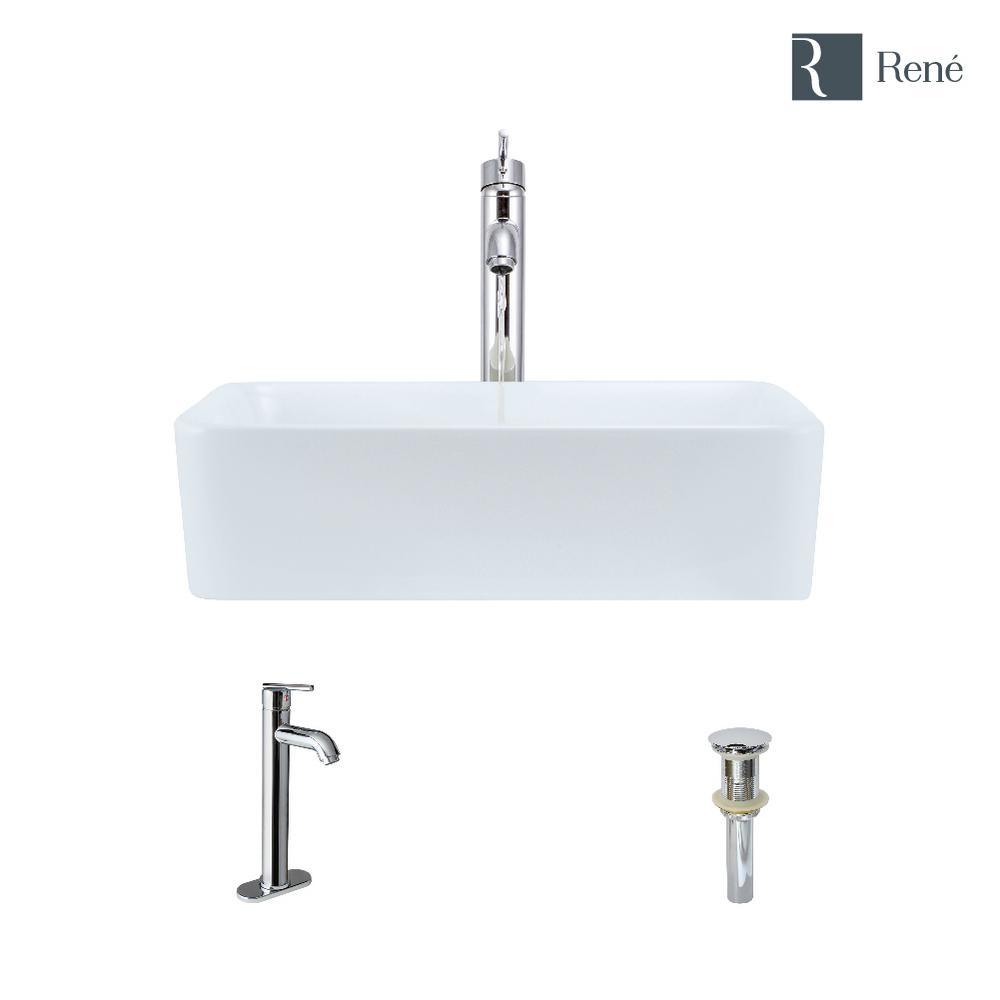 This attractive, white, porcelain basin is designed to be mounted atop the counter to display its natural beauty. Rectangular in shape, its vitreous china finish glistens with charm and durability. The R2-5007-W is constructed of solid porcelain but with a special additional enamel added at the end of its firing, turning it into a hardened, true, vitreous china. On its own, porcelain is both beautiful and durable, but the additional vitreous china coating creates an even more impervious and sanitary surface. It measures 19-1/8 in. x 14-3/4 in. x 5-1/4 in. The R9-7001-C is a tall, vessel-style faucet soundly constructed of premium-quality, solid brass components. Its design is cylindrical with a chrome finish and matching baseplate. Water temperature and pressure is controlled by the rod-style, swivel handle. Ceramic disc cartridges assure dependability. With a simple press to its handsome, chrome dome; the included, spring-loaded, vessel pop-up drain can be opened or closed.
