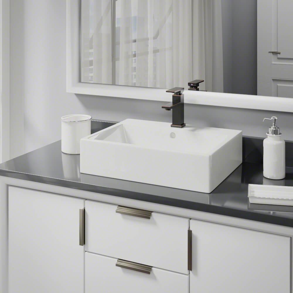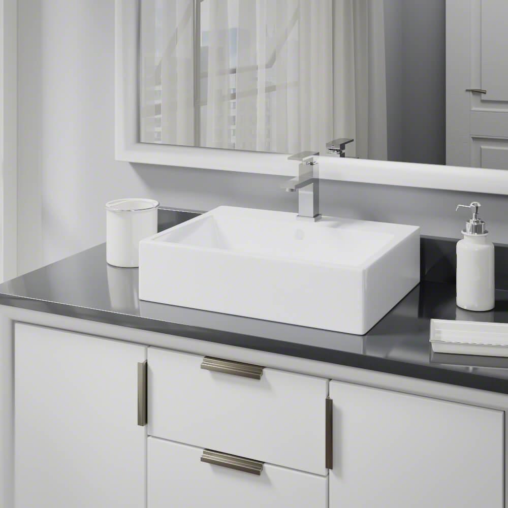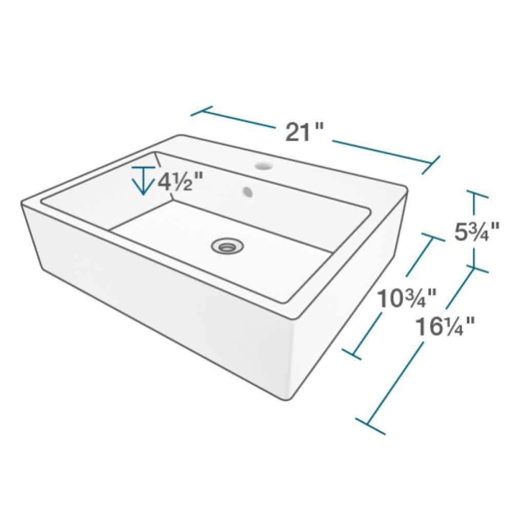 • Captivating form - a glistening, rectangular vessel with pre-drilled faucet hole and overflow