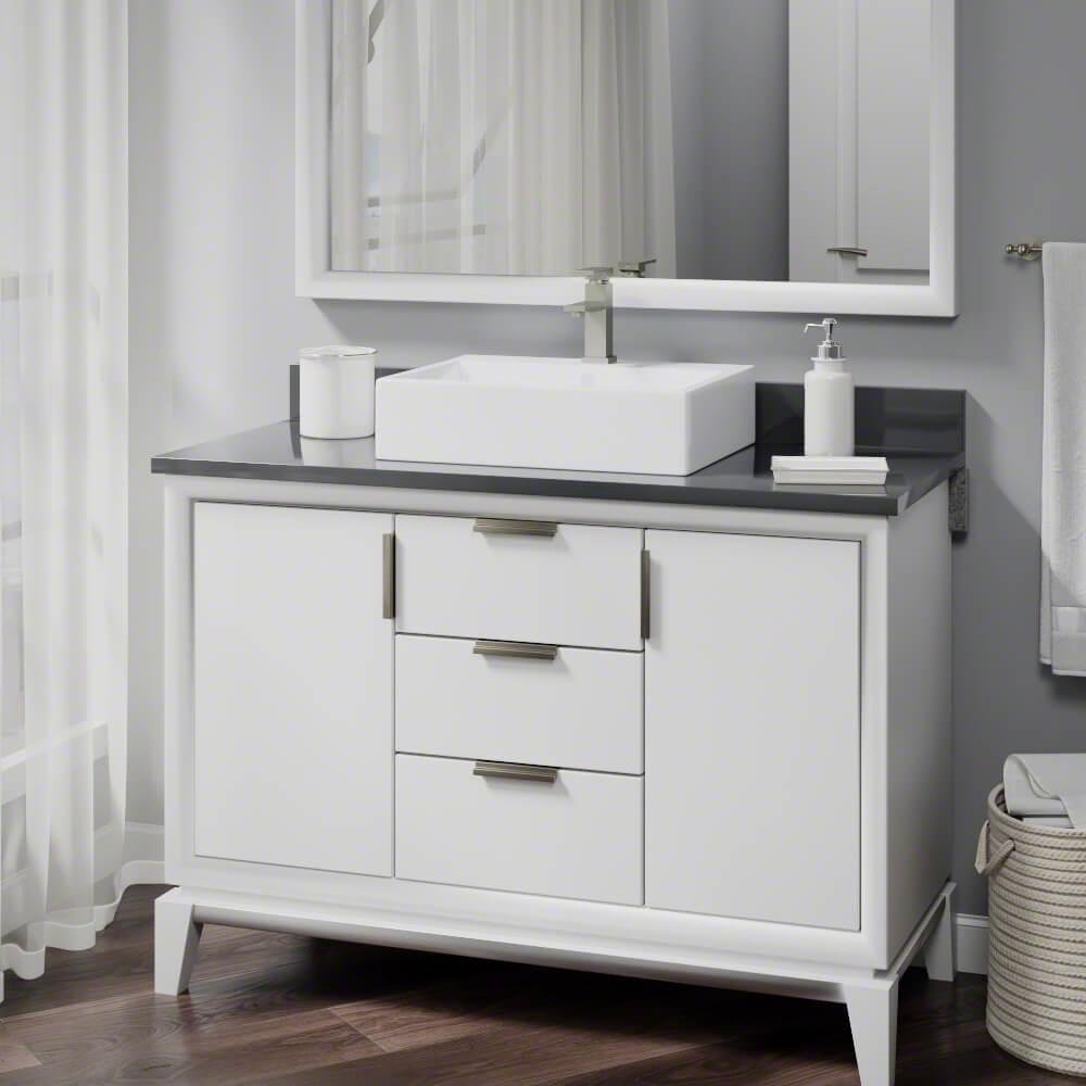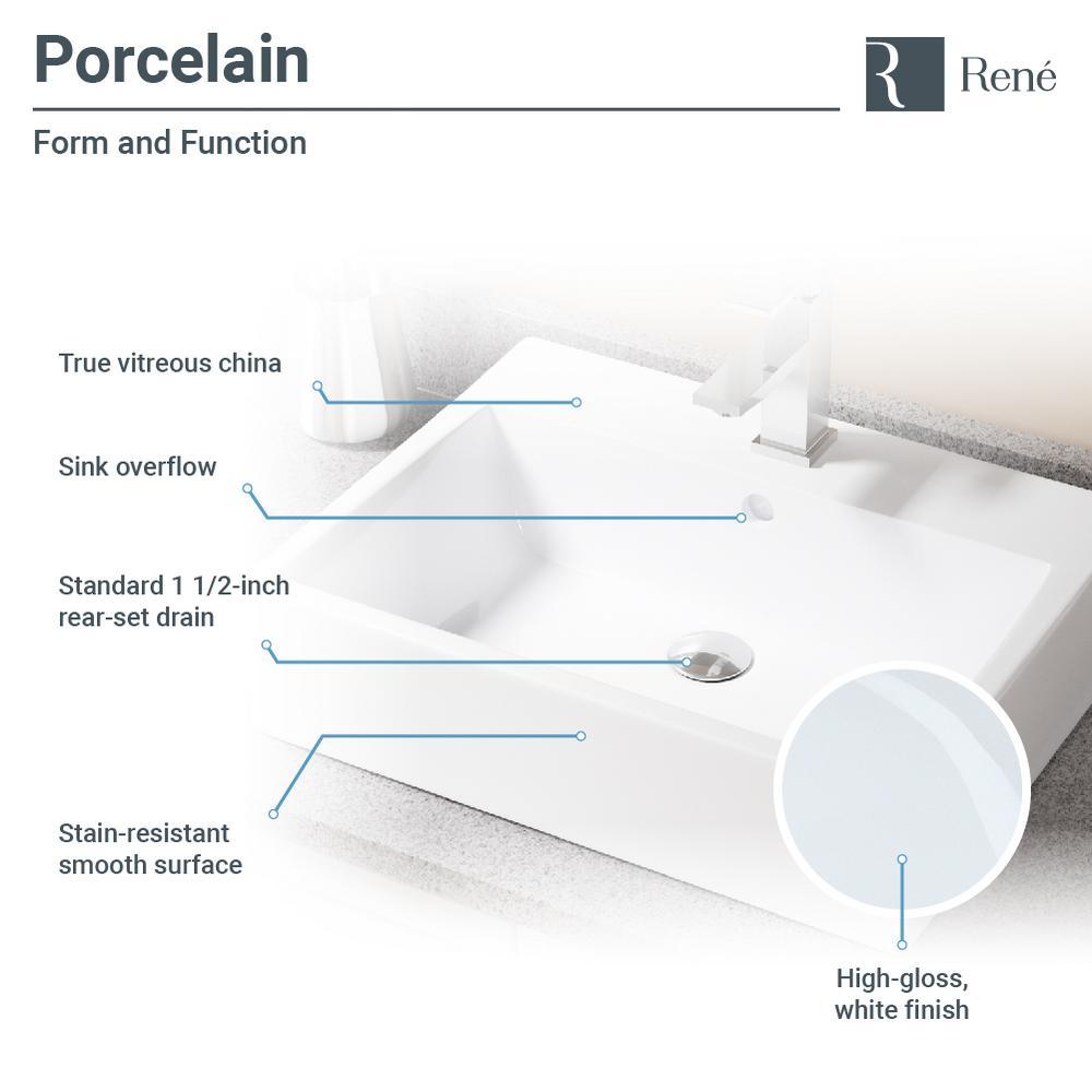 This attractive, white, porcelain basin is designed to be mounted atop the counter to display its natural beauty. Rectangular in shape, its vitreous china finish glistens with charm and durability. The R2-5018-W is constructed of solid porcelain but with a special additional enamel added at the end of its firing, turning it into a hardened, true, vitreous china. On its own, porcelain is both beautiful and durable, but the additional vitreous china coating creates an even more impervious and sanitary surface. It measures 21 in. x 16-1/4 in. x 5-3/4 in., with an offset drain, overflow, and pre-drilled faucet hole in its rear platform. The R9-7002-BN is a condensed, vessel-style faucet soundly constructed of premium-quality, solid brass components. Its design is angular with crisp edges and a brushed nickel finish. Water temperature and pressure is controlled by the extended, swivel handle. Ceramic disc cartridges assure dependability. With a simple press to its handsome, brushed nickel dome; the included, spring-loaded, vessel pop-up drain (vpud) can be opened or closed.