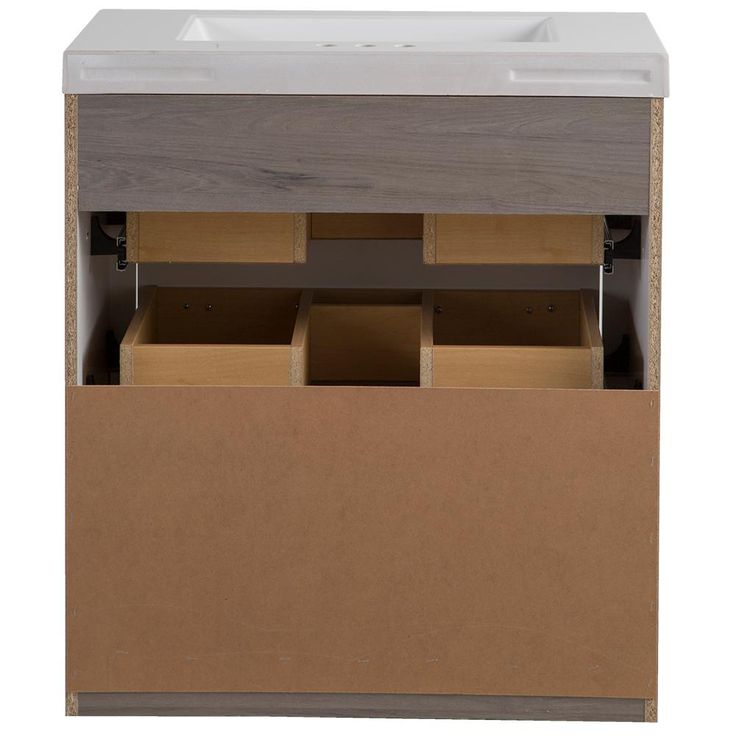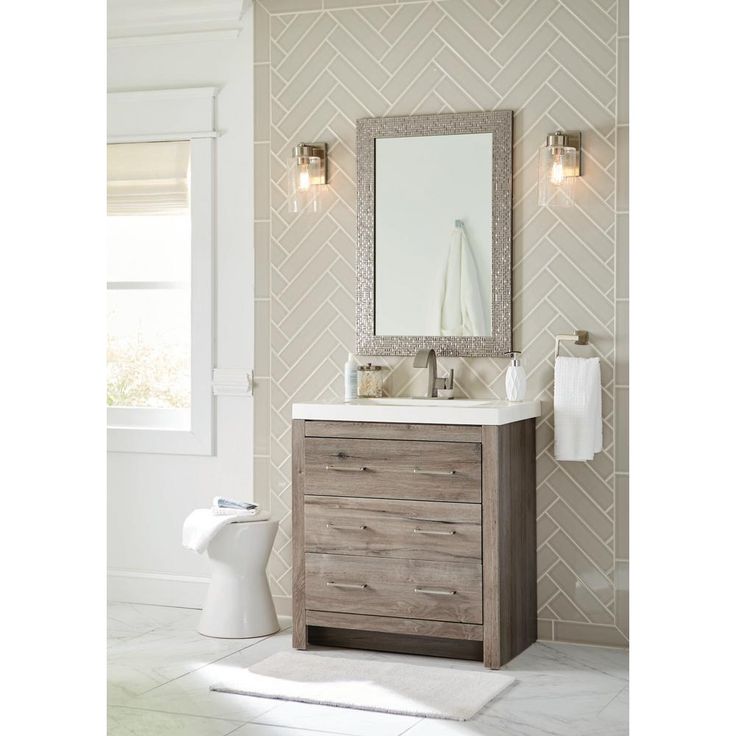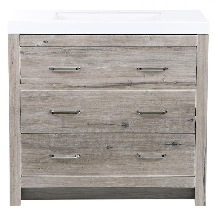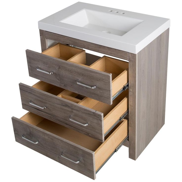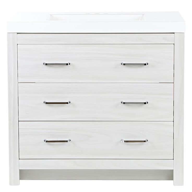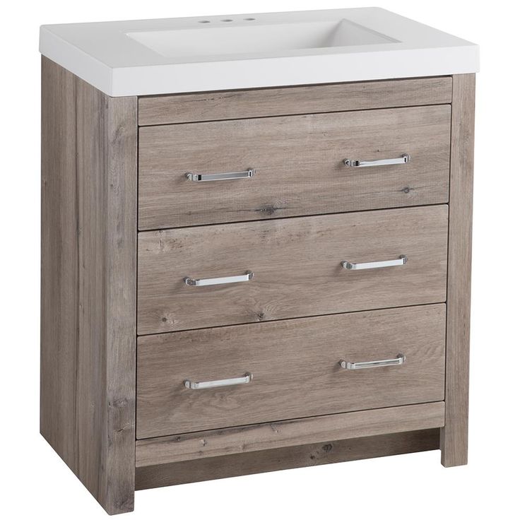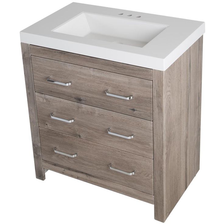 ​​Impress your guests with the chic Glacier Bay 30.5 in. W Woodbrook Vanity in White Washed Oak and White Vanity Top. The vanity cabinet delivers a white, weather washed finish coupled with a solid white vanity top with an extra thick 2.25 in. thick edge profile and color matching integrated rectangular sink. Fashioned with three working drawers, sleek hardware and full extension glides for all your bath needs, the 30.5 in. W Woodbrook Vanity is the perfect vanity for your home.