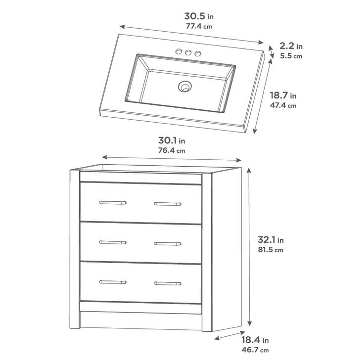• Assembled dimensions are 30.5 in. W x 18.75 in. D x 34.34 in. H