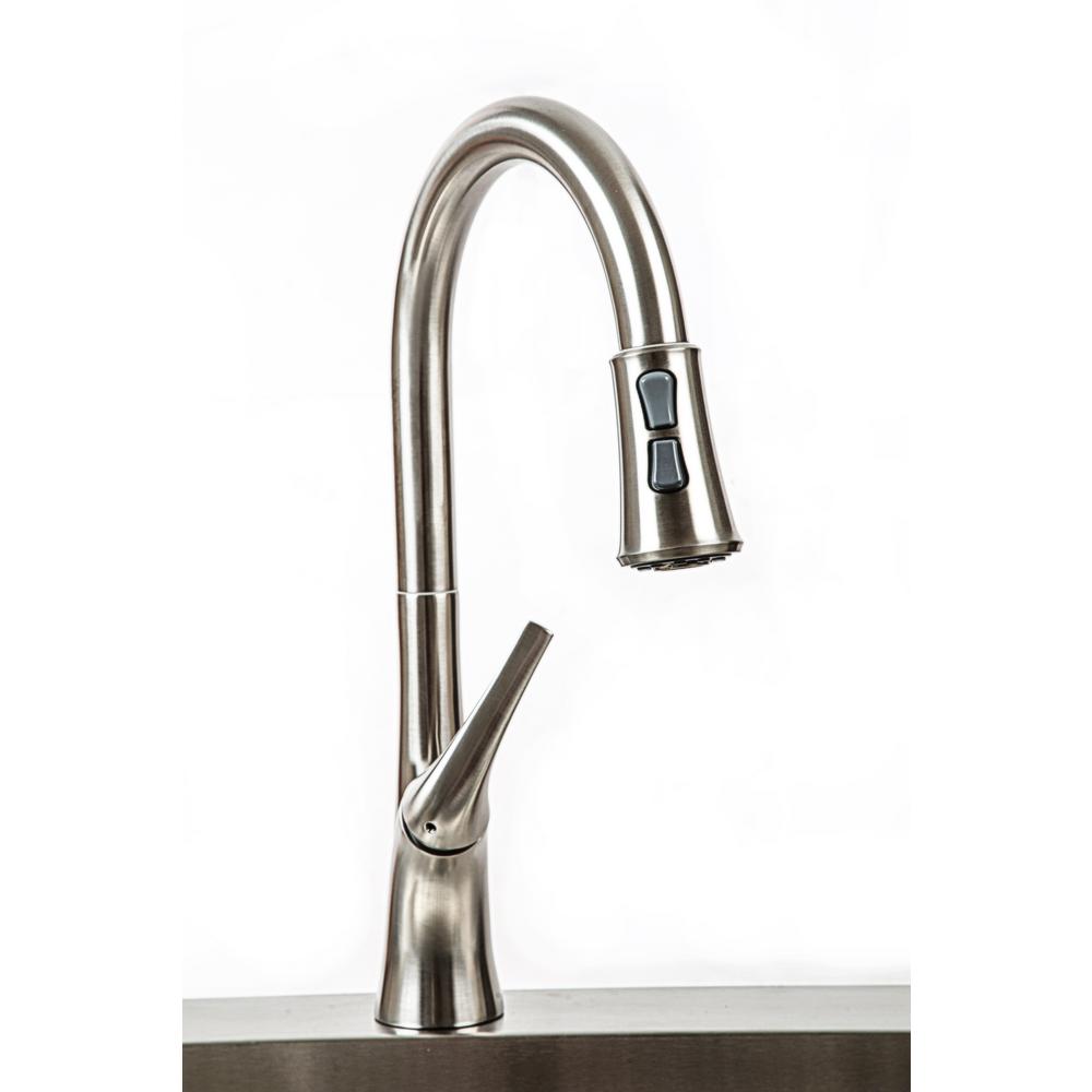 • Brush-nickel kitchen faucet with pull down sprayer head included