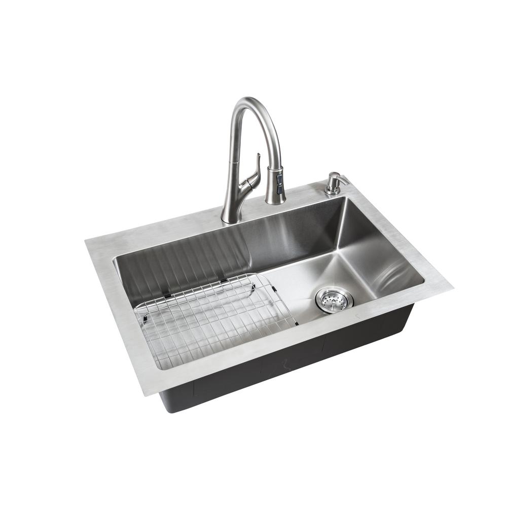 Glacier Bay All in One Dual Mount Tight Radius Corner Kitchen Sink can be installed as either a top mount or under mount. Made of durable 18-Gauge brushed stainless steel, the tight radius corner provides elegant appearance and easy cleaning. Sound insulation reduces waste disposal and water noise to help keep your kitchen quiet while you work. Includes a brushed nickel faucet with pull down sprayer head.
