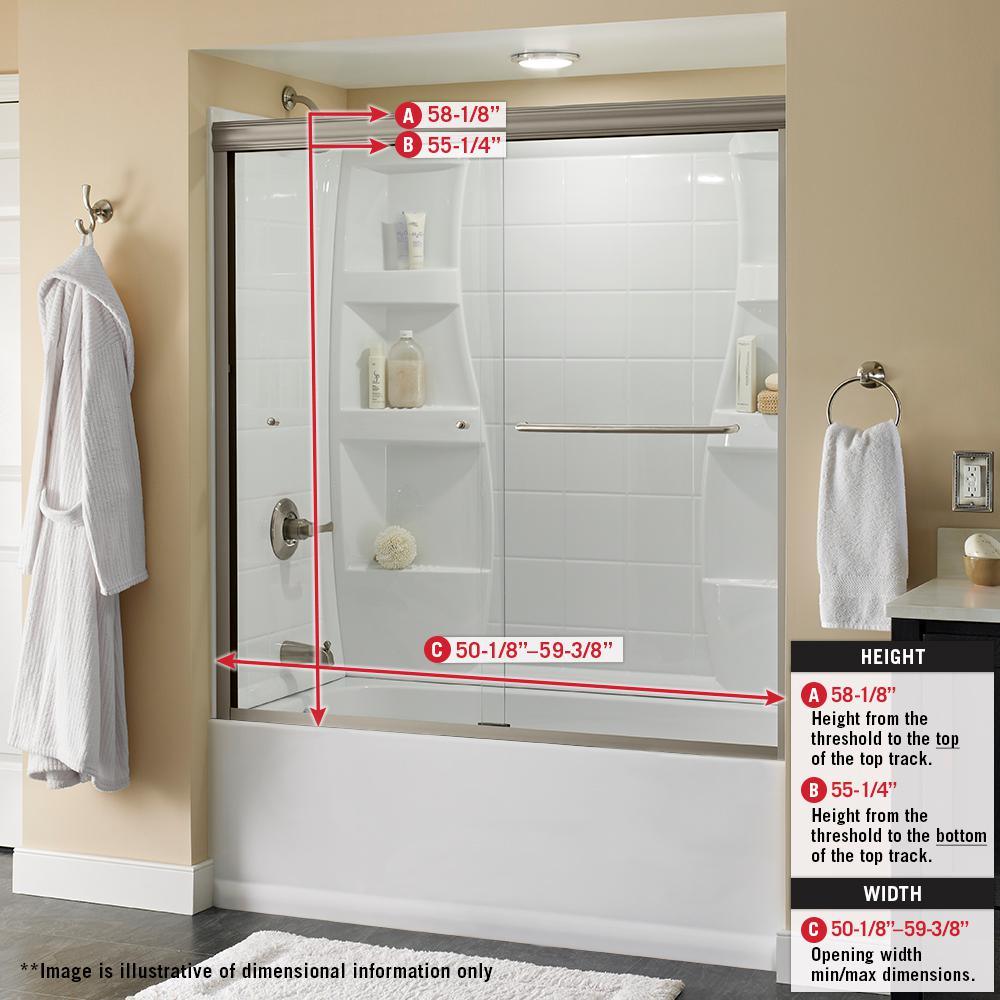 • Traditional sliding bathtub door designed to accommodate out-of-plumb (uneven, not vertically level) conditions totaling 3/8 in.