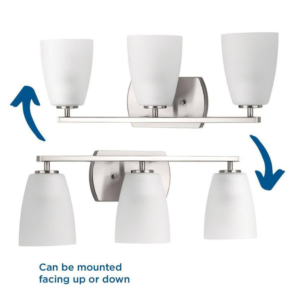 A clean, contemporary 3-light vanity fixture from Progress Lighting’s Leap Collection. Brushed nickel finish pairs with tapered etched glass shades to deliver bright, even illumination in bathrooms and powder rooms.