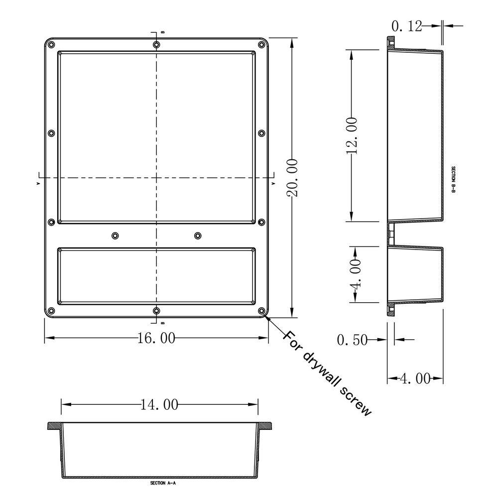 Look no further, heres the solution!Our prefabricated recessed niche is ready to tile. Constructed from ABS is lightweight, but very durable material, it is virtually indestructible without the clutter and leaks.Handmade niches typically experiences major problems in the long run, however with the prefabricated niche, it will not mold, mildew, rust or leak and 100% guarantee waterproof and leak-proof. Tile set directly on niche surface simple and quick install vertically or horizontally depending on your design. Fits standard wall framing. Make your shower niche a design focal point and still be able to place your shower necessities.Pre-fabricated shower niche that is fully sealed, hassle-free, quick and easy installation install niche flush with cement board; makes traditional tedious shower niche installation effortless!100% guaranteed waterproof and leak-proof. Compare with traditional handmade shower niche having a high risk of leakage and cause mold problems Constructed with light weight yet durable ABS material, strong bond with polymer modified thin-set mortar, highly resistant to corrosive chemicals and physical impactsCan be install vertically or horizontally according to your bathroom design and needs Overall Dimension: 16 in. x 20 in. x 4 in. : Inside Dimension (Shelf 1): 14 in. x 12 in. x 4 in. : Inside Dimension (Shelf 2): 14 in. x 4 in. x 4 in.