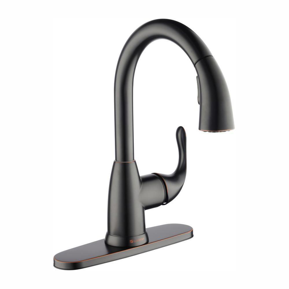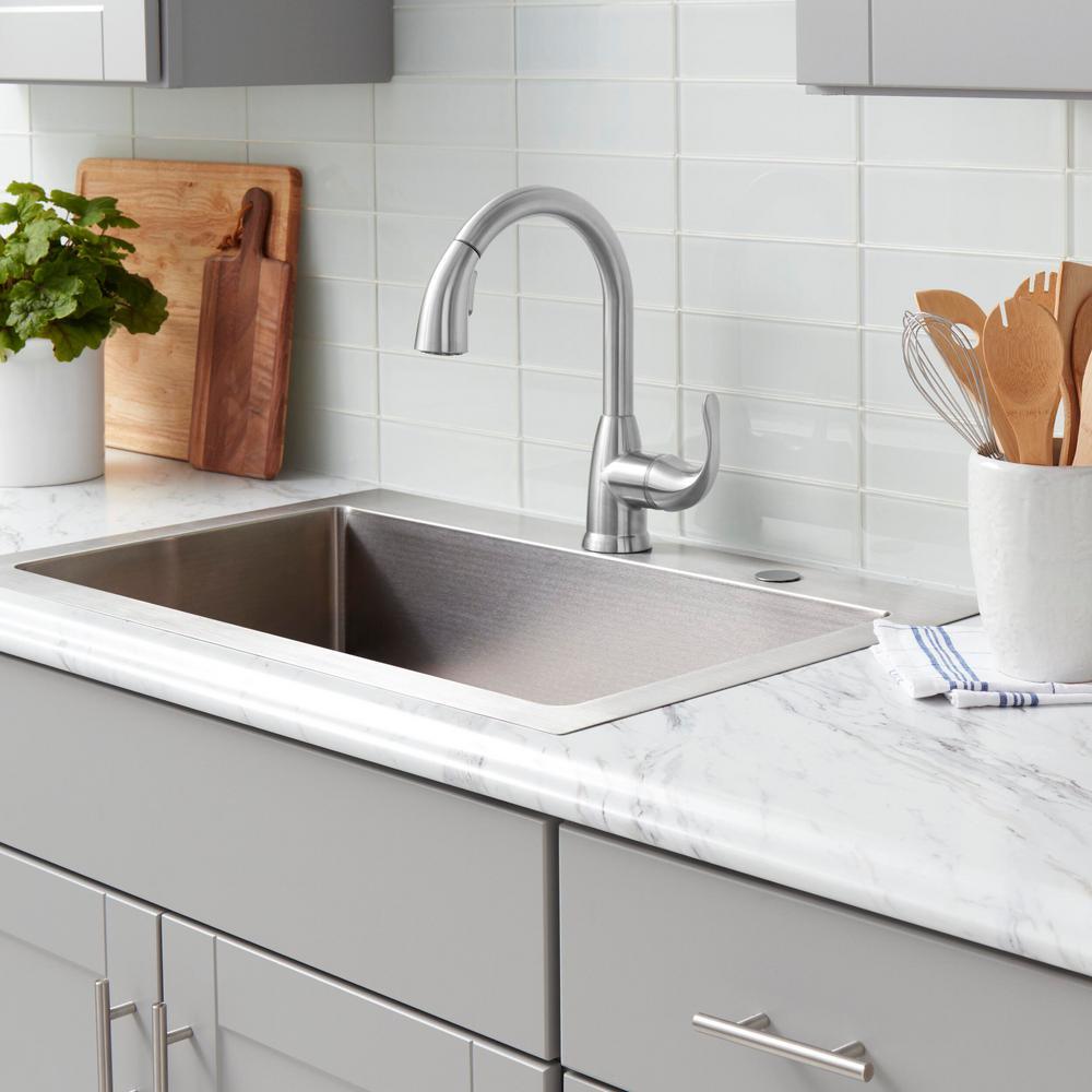 This Glacier Bay Dylan Single-Handle Pull-Down Sprayer Kitchen Faucet boasts a powerful TurboSpray setting for your toughest cleaning tasks. The exclusive feature provides focused water columns with 30 percent more power than standard pull-down faucets. This single-handle kitchen faucet enables easy and precise water temperature control, while providing a 1.8 GPM flow rate for outstanding water flow. Its ceramic disc cartridge ensures drip-free performance. Get ample kitchen space from its high-arc spout and a modern look with its stainless steel finish and curved minimalist design. Installation is quick and easy with this kitchen faucet’s FastMount system.