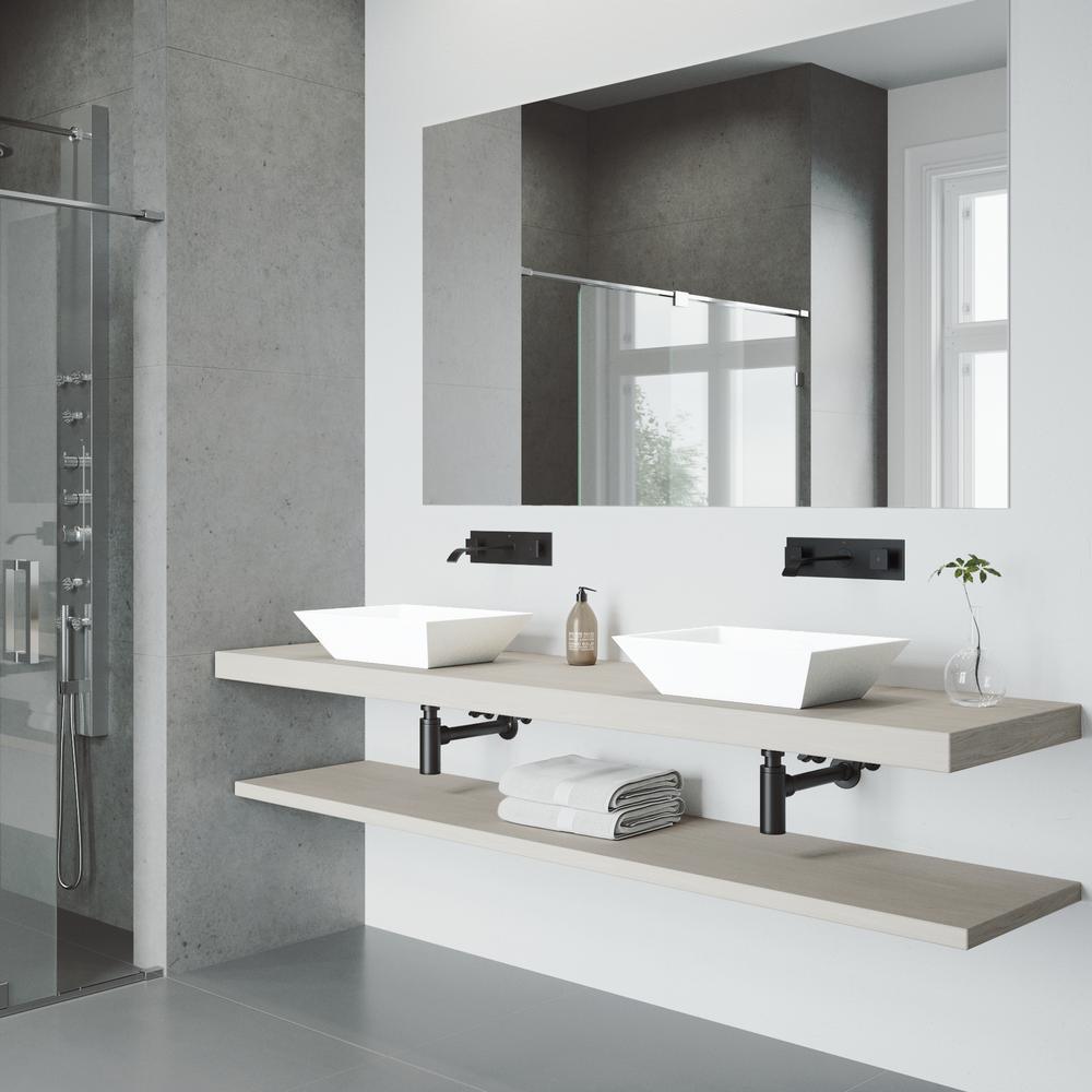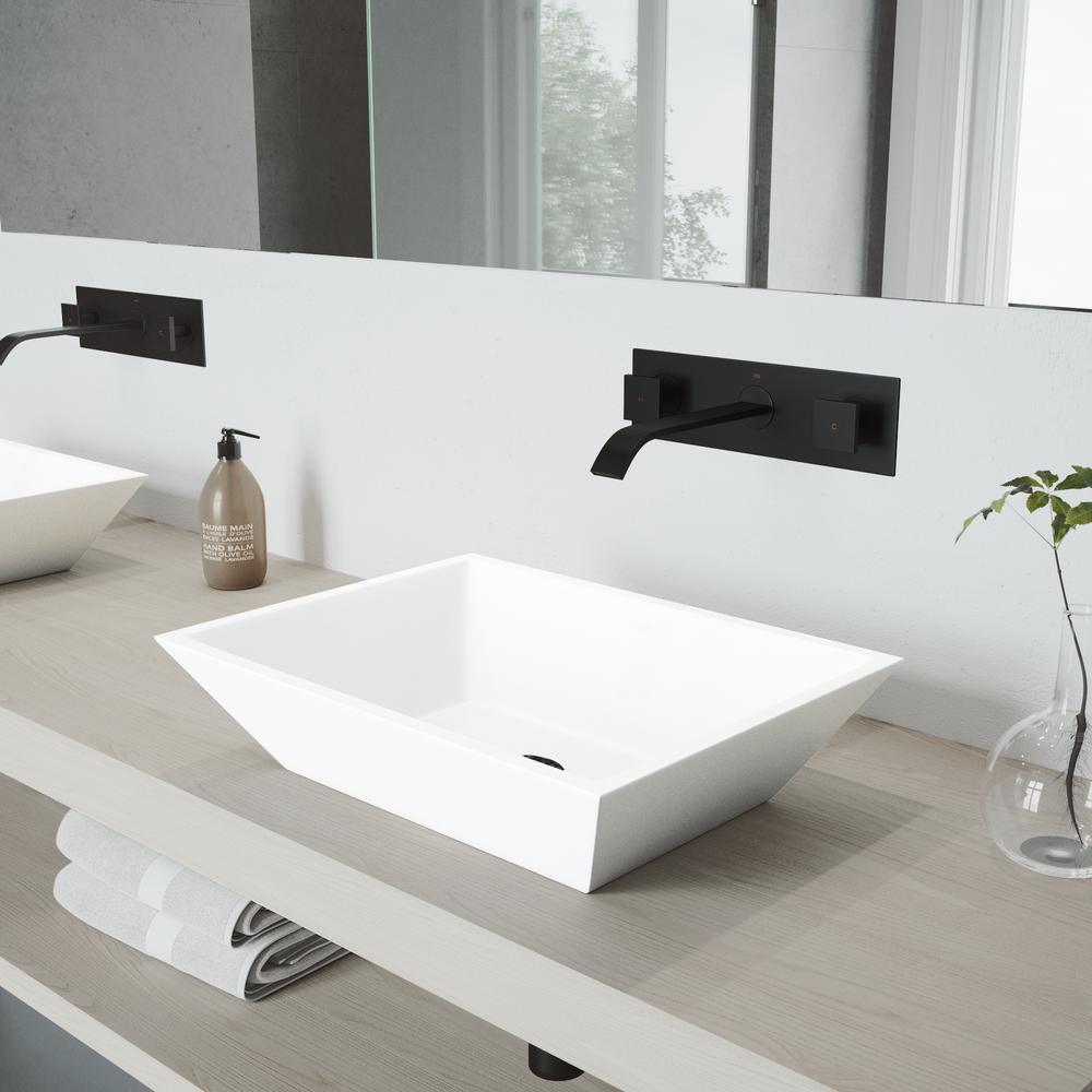 Living the VIGO lifestyle means your home will be anything but basic. The VIGO Vinca Matte Stone Vessel Bathroom Sink Set with the Titus Wall-Mount Faucet reflects the best of minimalism. The sink's Matte Stone construction is from solid composite; it resists stains, scratches and impact, providing resilience for years to come. The Titus faucet, built from solid brass, features two handles to adjust the hot and cold water controls. Its wall-mount configuration keeps for an open countertop and a sleek appearance. Complementing these two is the matching finish pop-up drain.