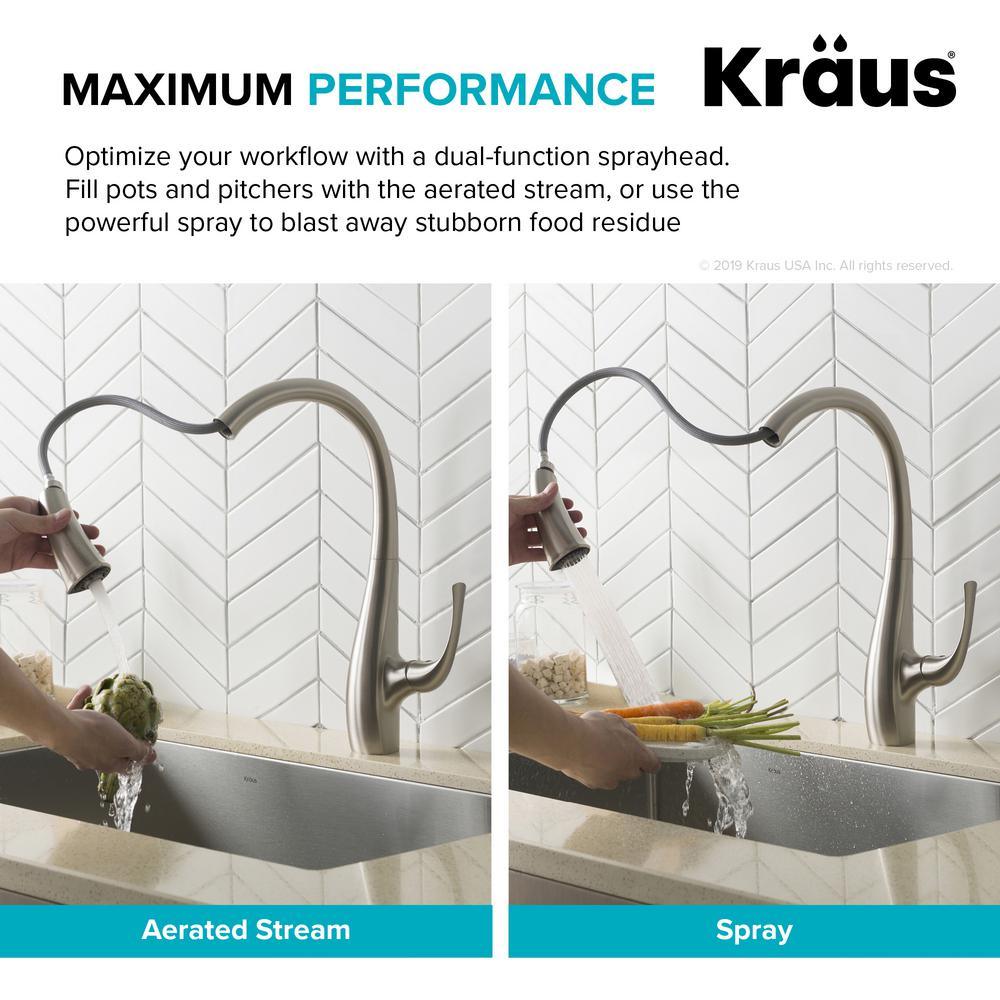 Upgrade your kitchen with the transitional Ansel pull-down faucet, featuring an ergonomic dual-function spray head that offers an aerated stream and powerful rinsing spray. A flexible nylon hose with swivel adapter offers unparalleled range of motion and effortless movement all around the sink. Soft rubber nozzles allow you to instantly wipe away lime scale build-up, for a long-lasting optimized flow.