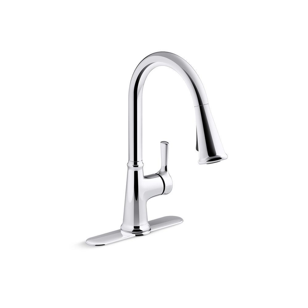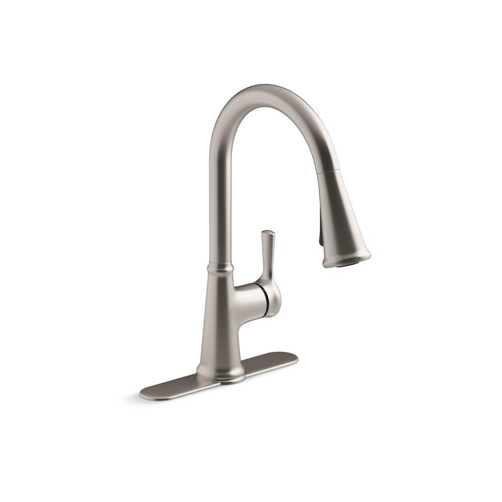 With clean lines, the Tyne kitchen faucet is a beautifully simple addition to nearly any decor. The high-arching spout easily clears pots and pans while the pull-down sprayhead featuring Sweep spray delivers a wide, forceful spray, simplifying kitchen cleanup. Pre-assembled supply hoses and quick-connect fittings make installation easy.