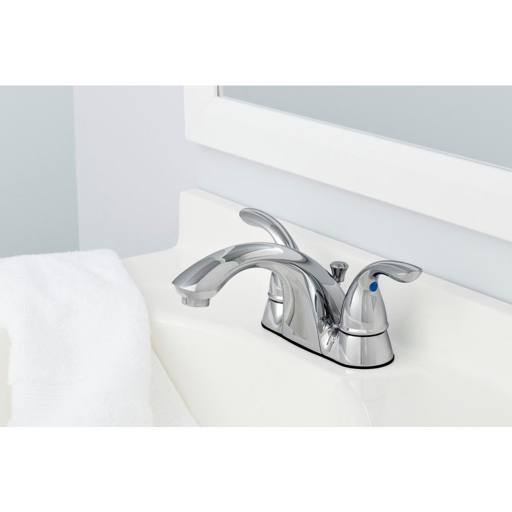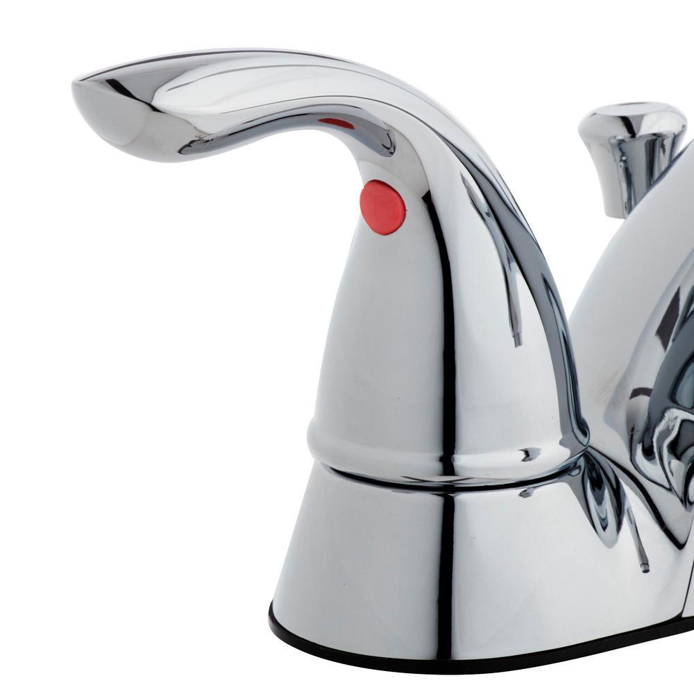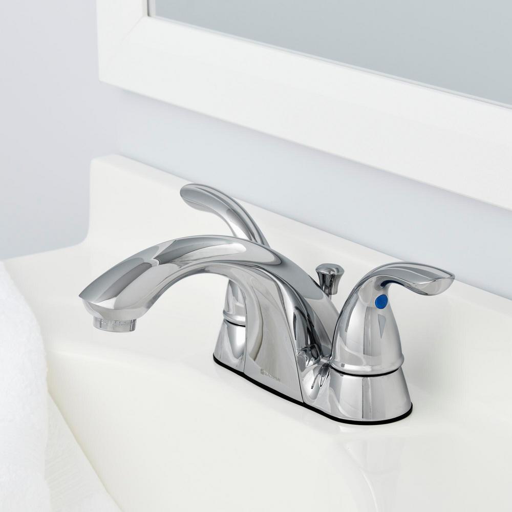 The Glacier Bay Builders 4 in. Centerset 2-Handle Low-Arc Bathroom Faucet in Chrome is sleek and durable and will complement a variety of bathroom decor. WaterSense certified with a 1.2 GPM water flow rate to help reduce water use, this faucet meets and exceeds the highest standards of efficiency. Ceramic disc cartridges ensure a drip-free performance. The 2-handle design, low-arc spout and deck-plate mount with 1/2 in. connection make this faucet easy to use and easy to install. Featuring the Glacier Bay exclusive ClickInstall drain for quick and simple installation. Pair with other pieces from the Builders Collection for a complete and polished look.