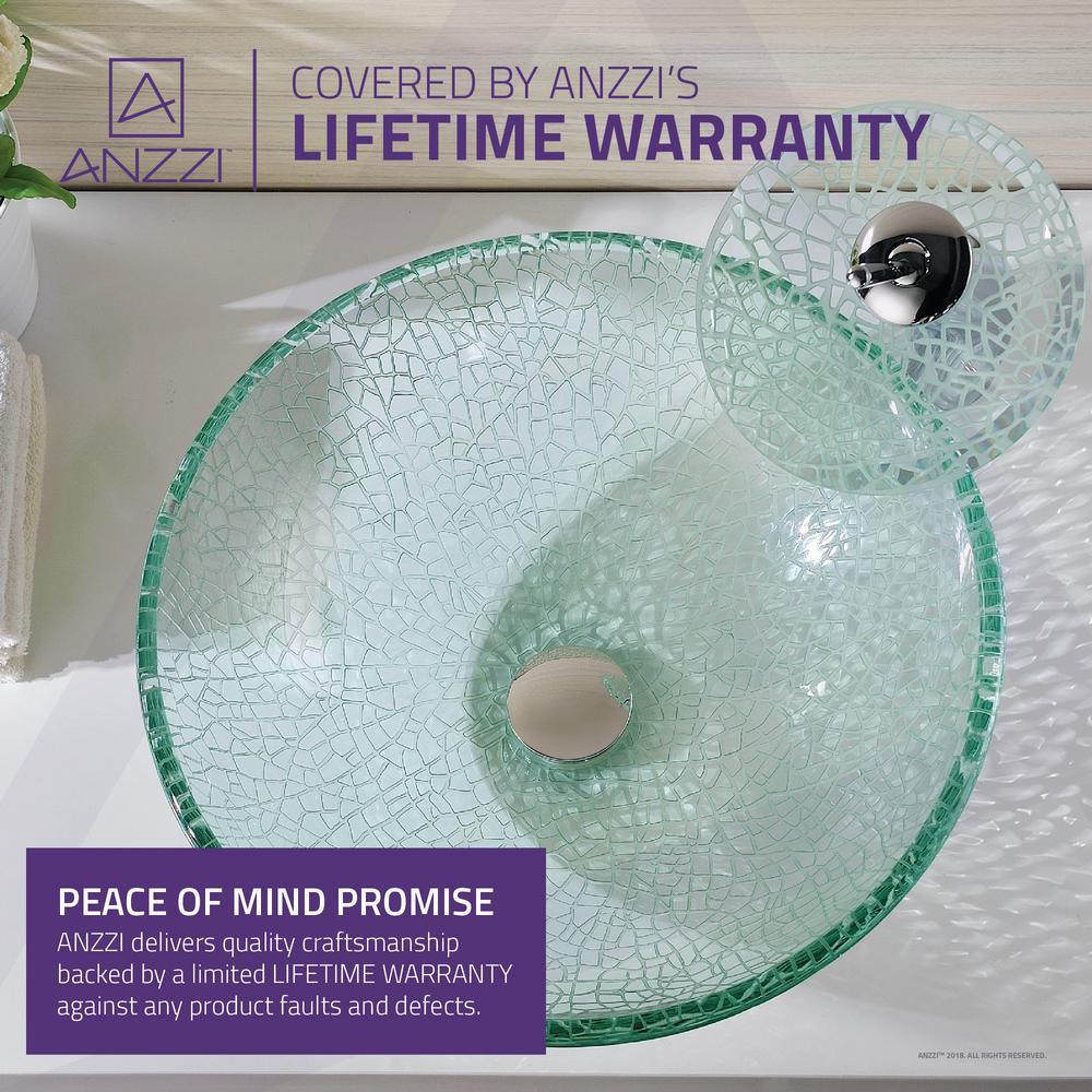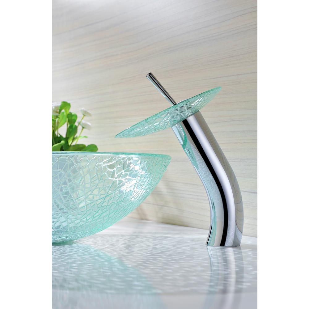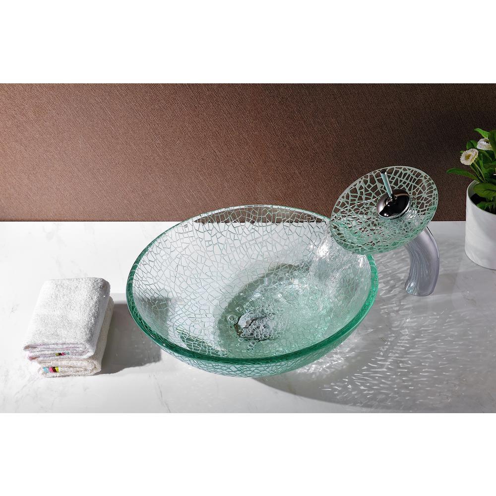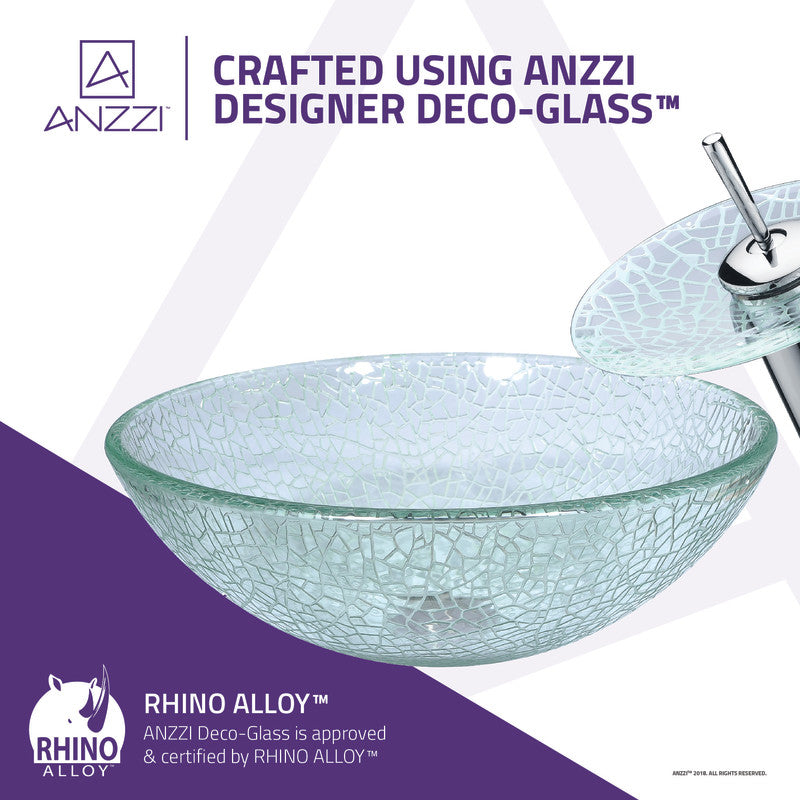 ANZZI Paeva Deco-Glass Vessel Sink in Crystal Clear Chipasi with Matching Chrome Waterfall Faucet, 16.5 x 5.75 in